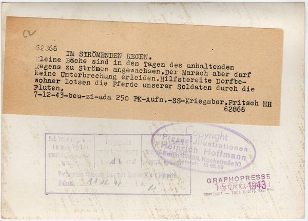 Originele Wo2 Duitse Waffen SS Persfoto - Oost-Europese boeren helpen soldaten met hun paarden in de regen (1943)