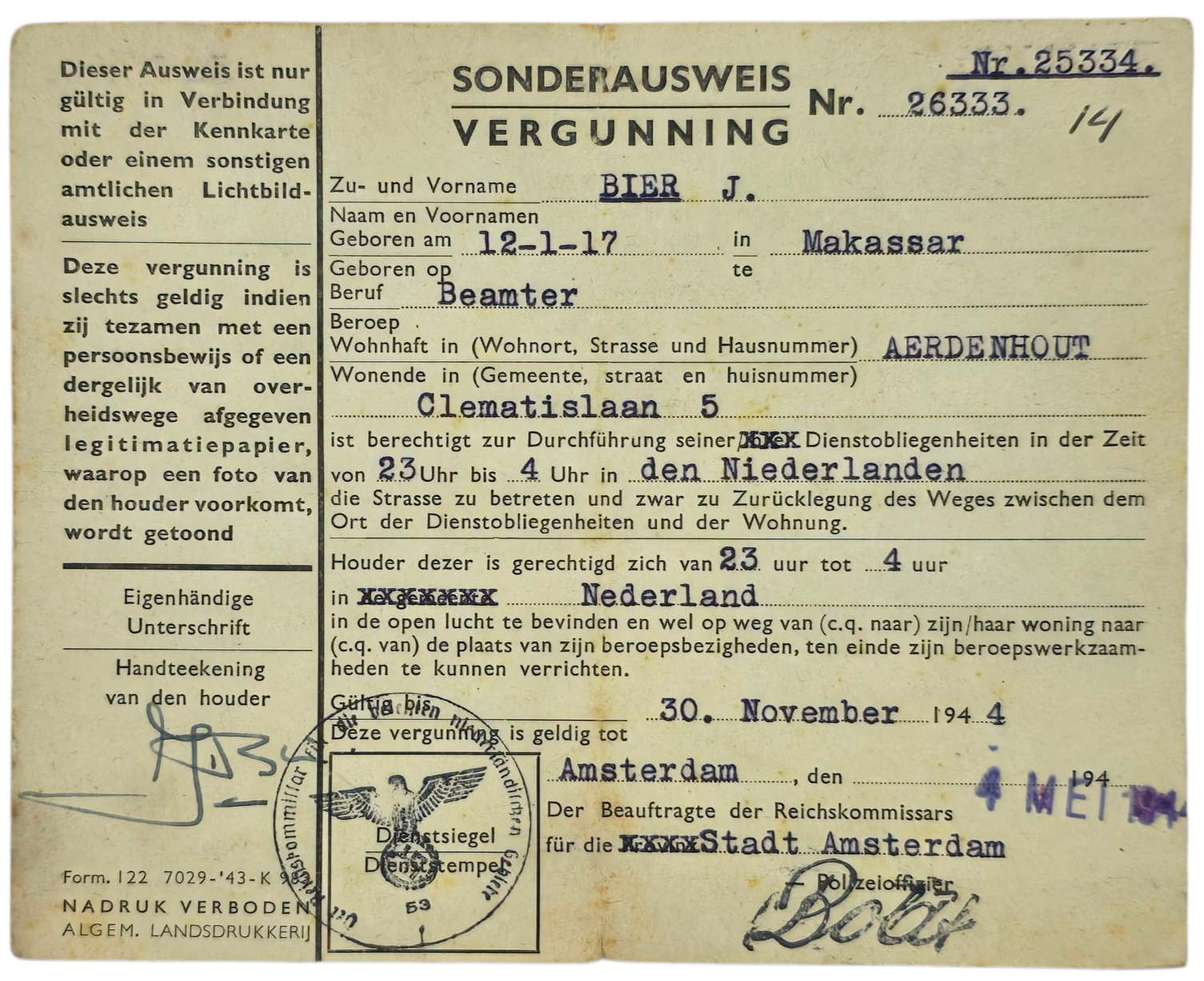 Original WW2 Dutch Document - Sonderausweis Makassar, Aerdenhout, Amsterdam (1944)