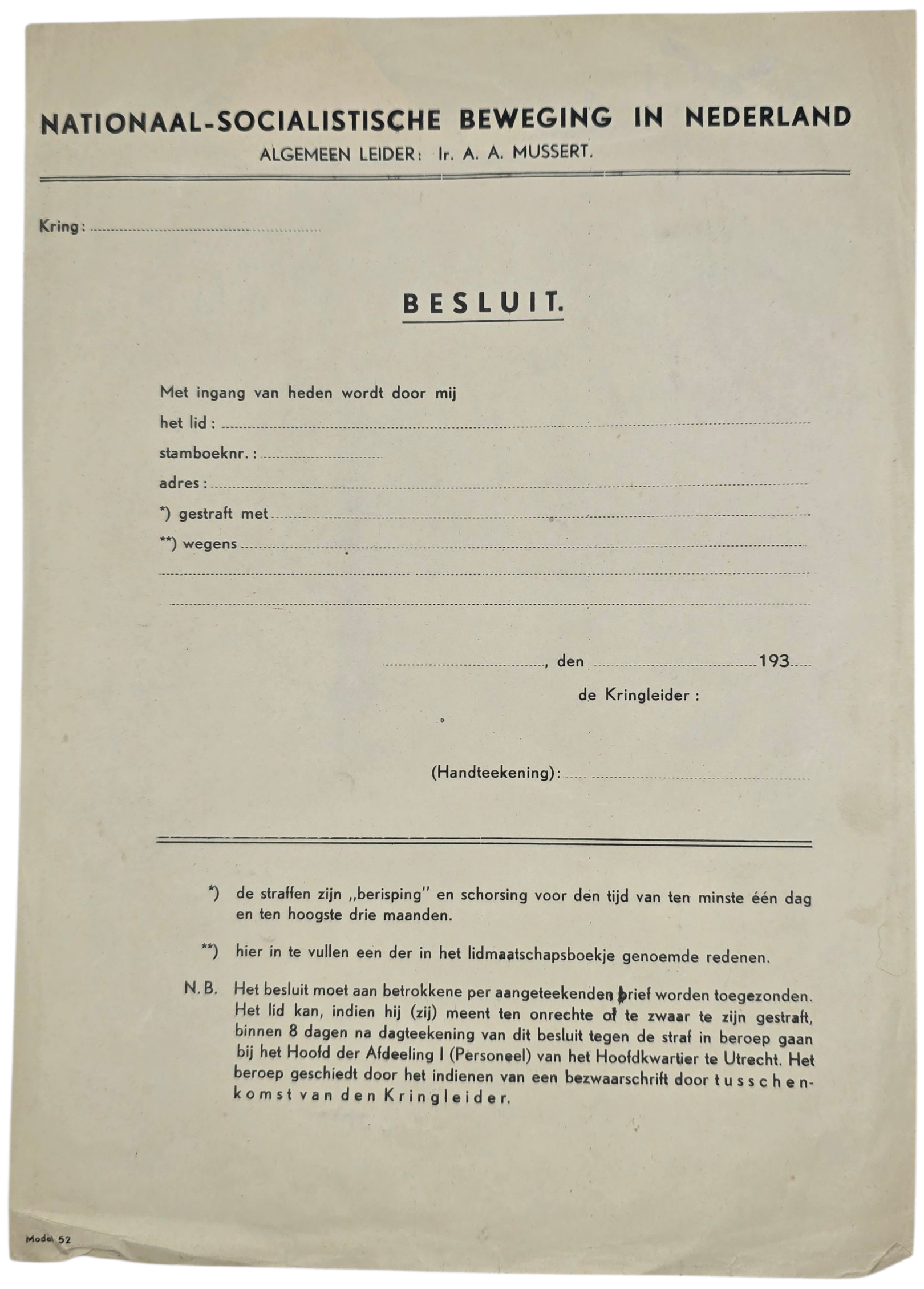 Original WW2 Dutch Collaboration NSB Document - Unissued decision for punishment NSB