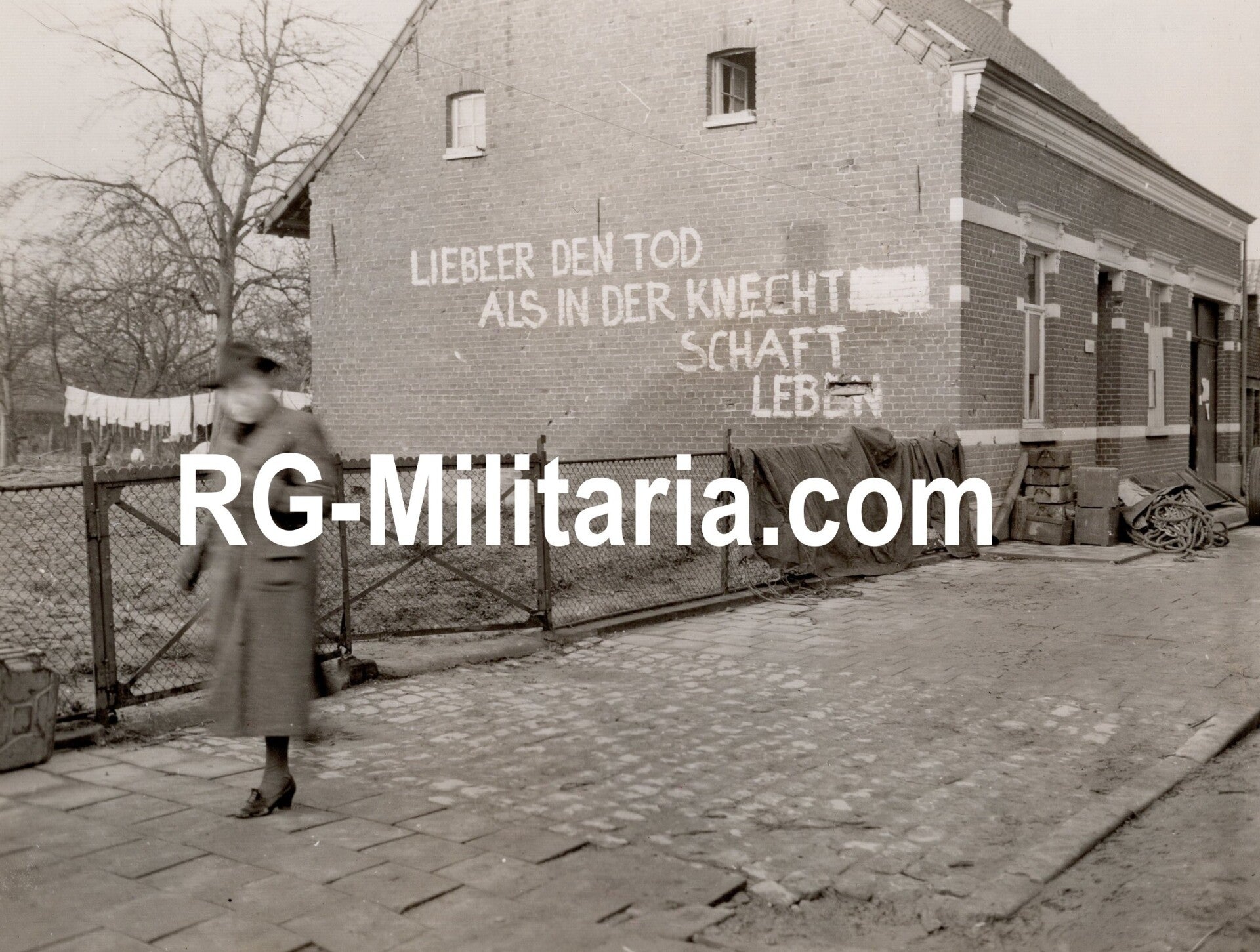 Original WW2 US Press Photo - Large graffiti wall ''Lieber den tod als in der Knechtschaft leben'' in Echt, Holland (1945)