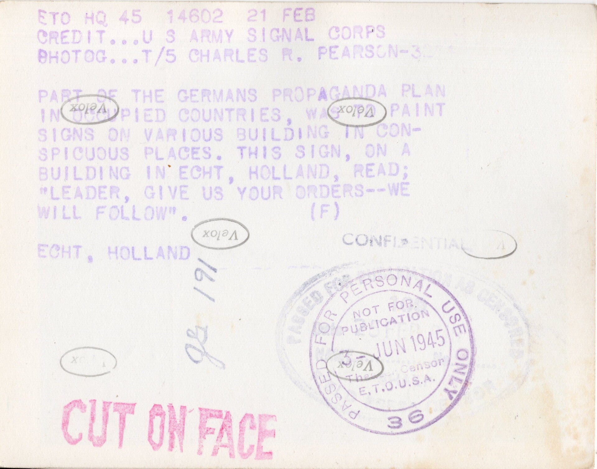 Original WW2 US Press Photo - Large graffiti wall ''Führer, befiehl wir folgen dir'' in Echt, Holland (1945)