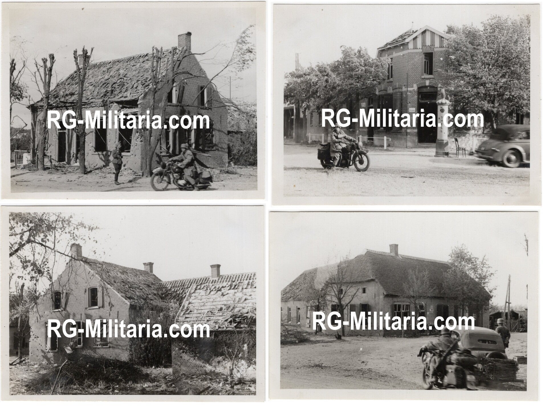 Original WW2 German Photo - Germans riding through the destroyed Langenboom houses, Mill, Peel-Raamstelling, Blitzkrieg on Holland, May (1940)