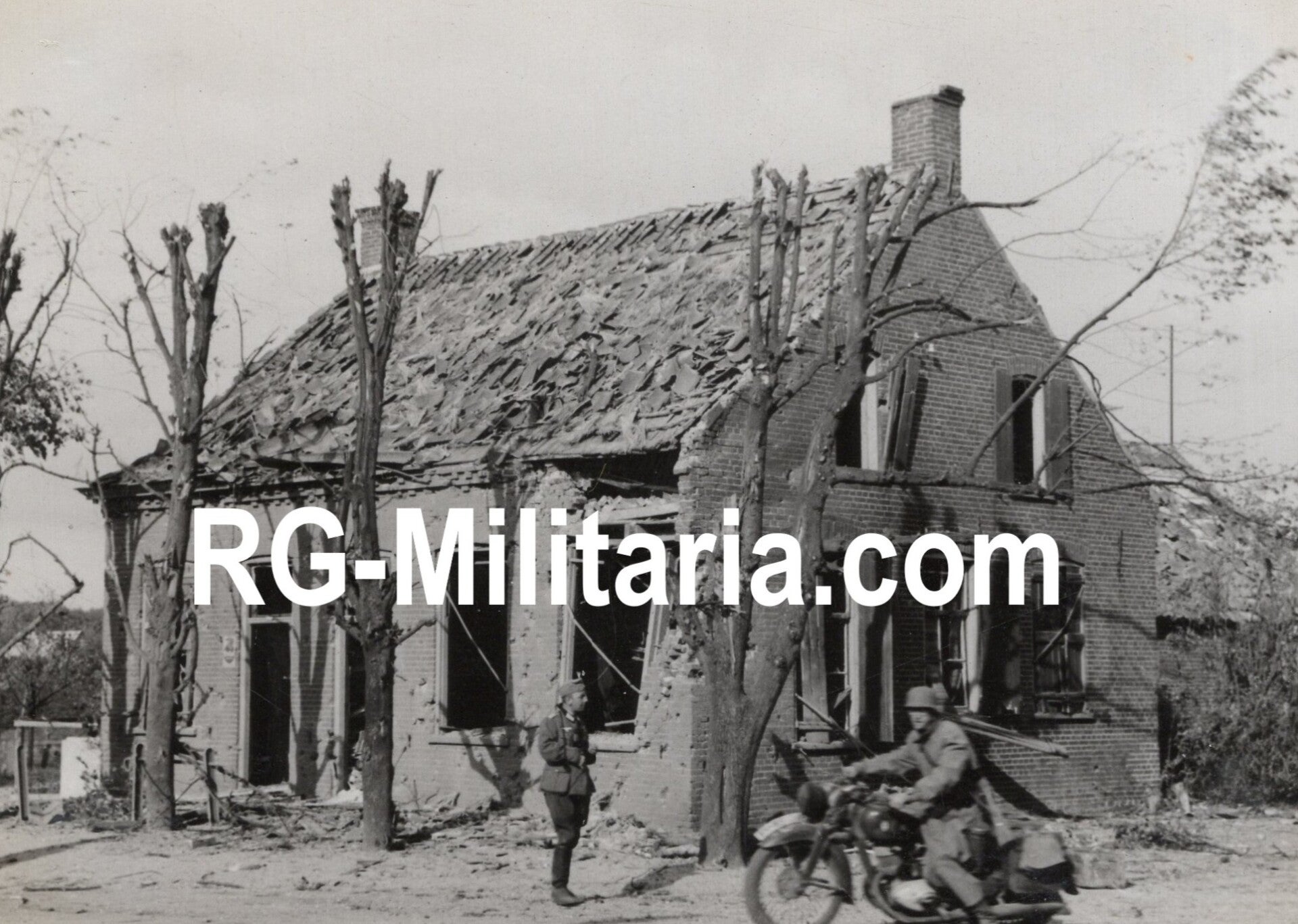 Originele Wo2 Duitse Foto - Duitsers rijden door de verwoeste Langenboom-huizen, Mill, Peel-Raamstelling, Blitzkrieg op Holland, mei (1940)
