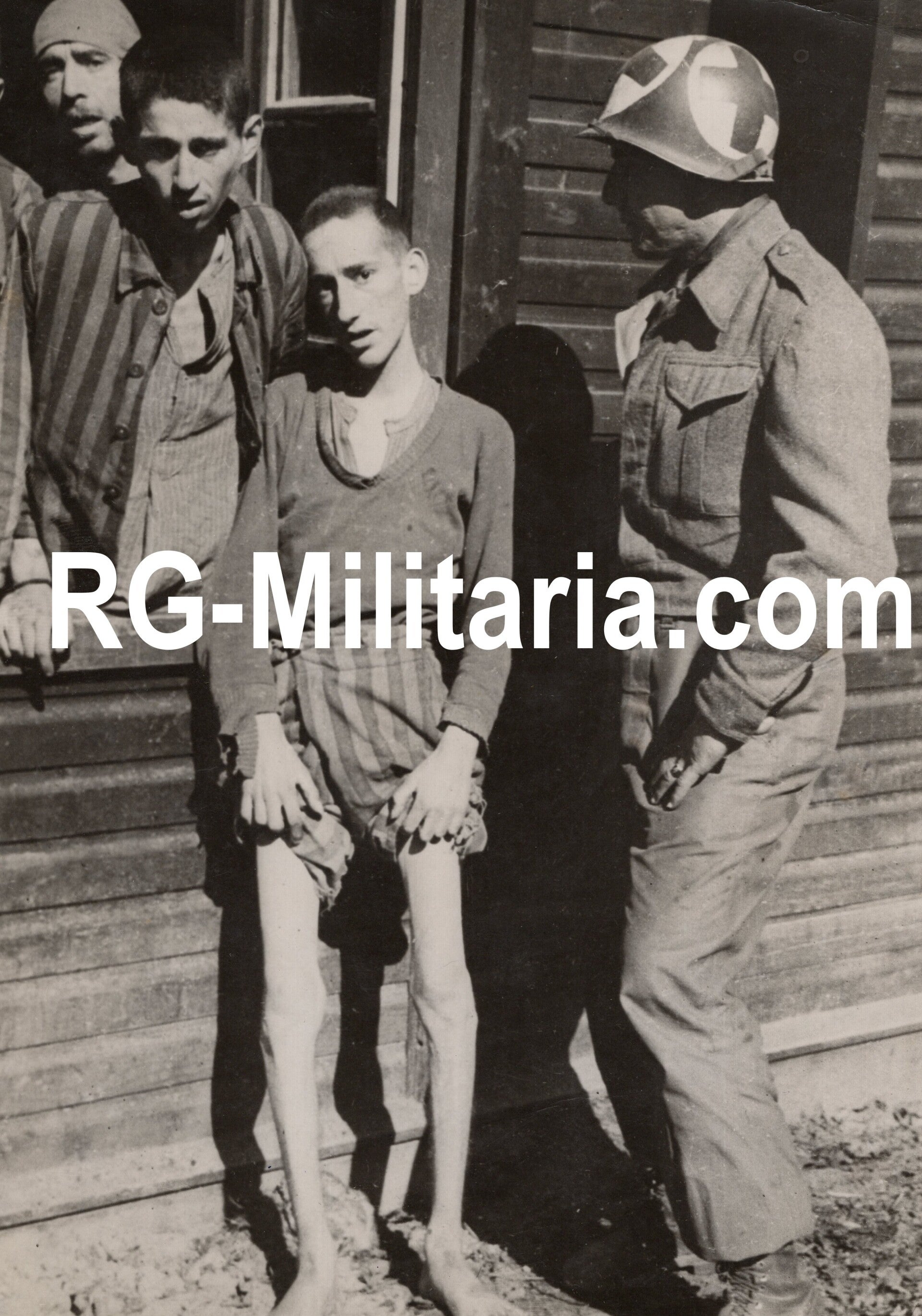 Original WW2 US Press Photo - US Medic soldier with prisoners of the Langenstein Concentration Camp (1945)