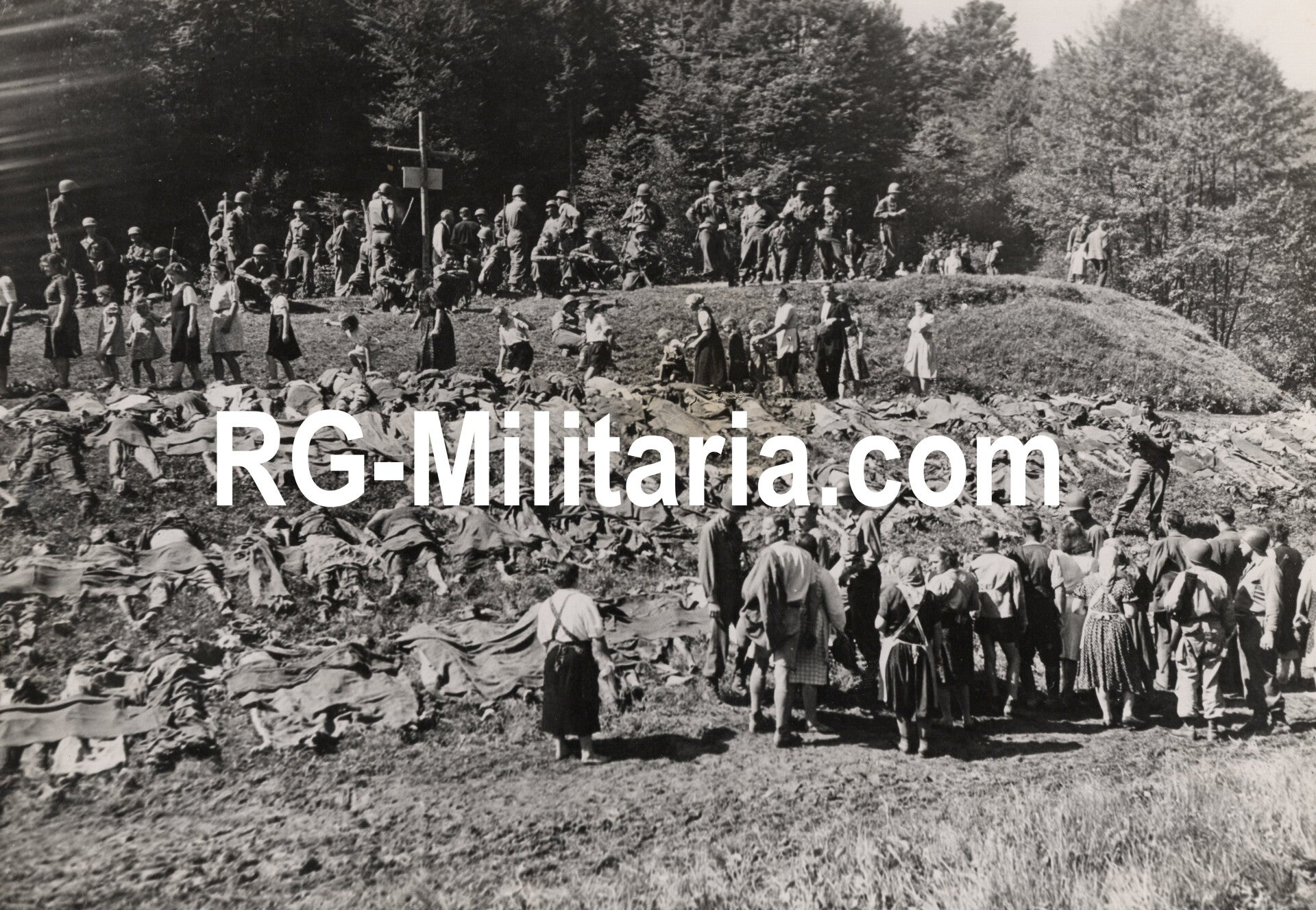 Original WW2 US Press Photo - German civilians view the murdered Buchenwald & Flossenburg concentration camp prisoners (1945)