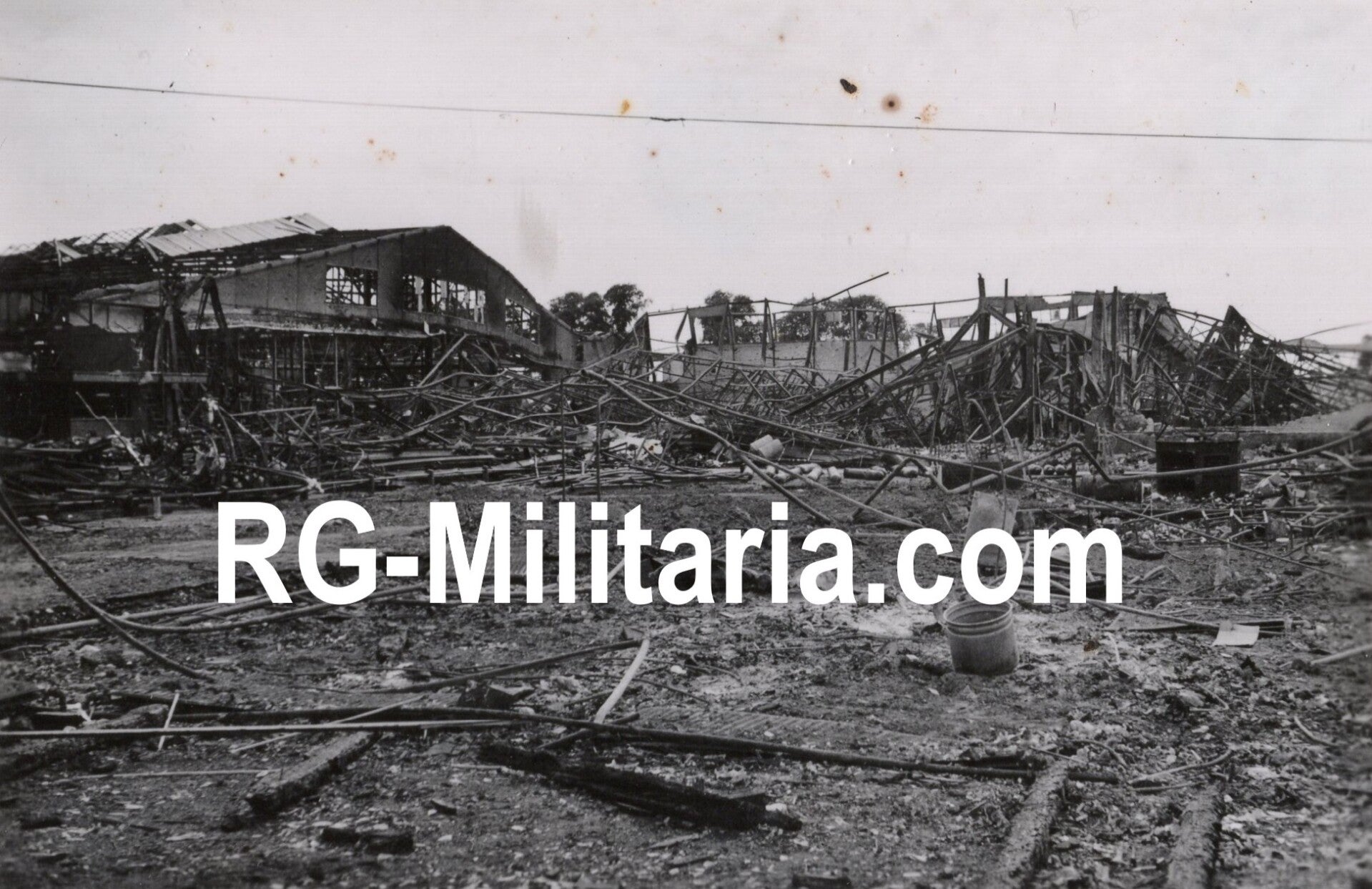 Originele Wo2 Duitse Foto - Uitgebrandde hangaar op het Rotterdamse vliegveld Waalhaven, Nederland (1940)