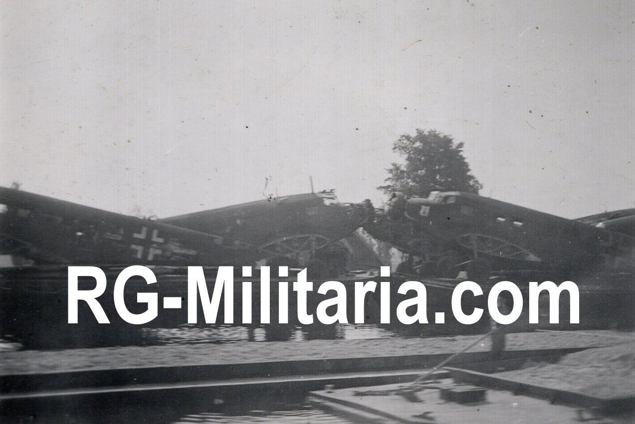 Originele Wo2 Duitse Foto - Transport van Junkers JU 52 vliegtuigen met pontonboten naar de Fokkerfabriek bij Schiphol, Amsterdam (1940)