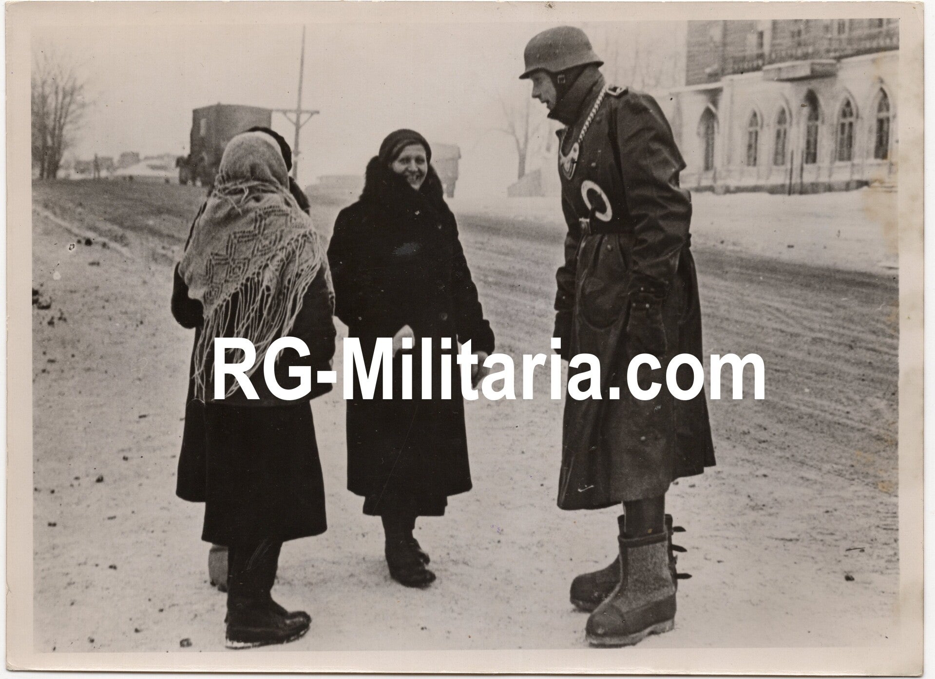 Original WW2 German Press Photo - Feldgendarmerie talking with locals near Moscow, Eastern Front (1942)