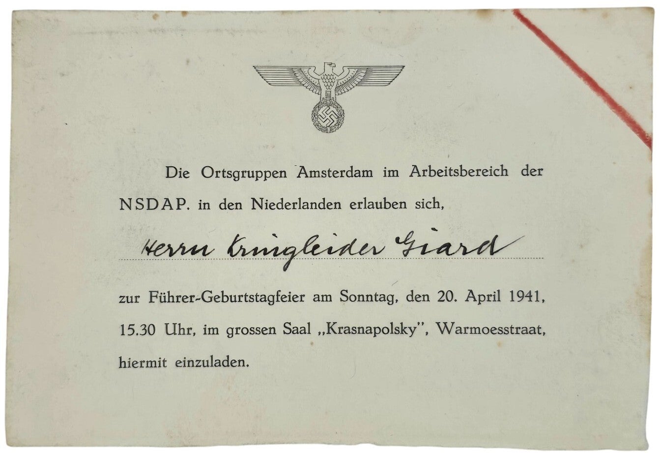 Invitation card from the Ortsgruppe Amsterdam im Arbeitsbereich der NSDAP in den Niederlanden to the Dutch Collaborator NSNAP kringleider Giard for the birthday of Adolf Hitler on the 20th of April 1941 in Krasnaposlky, Amsterdam