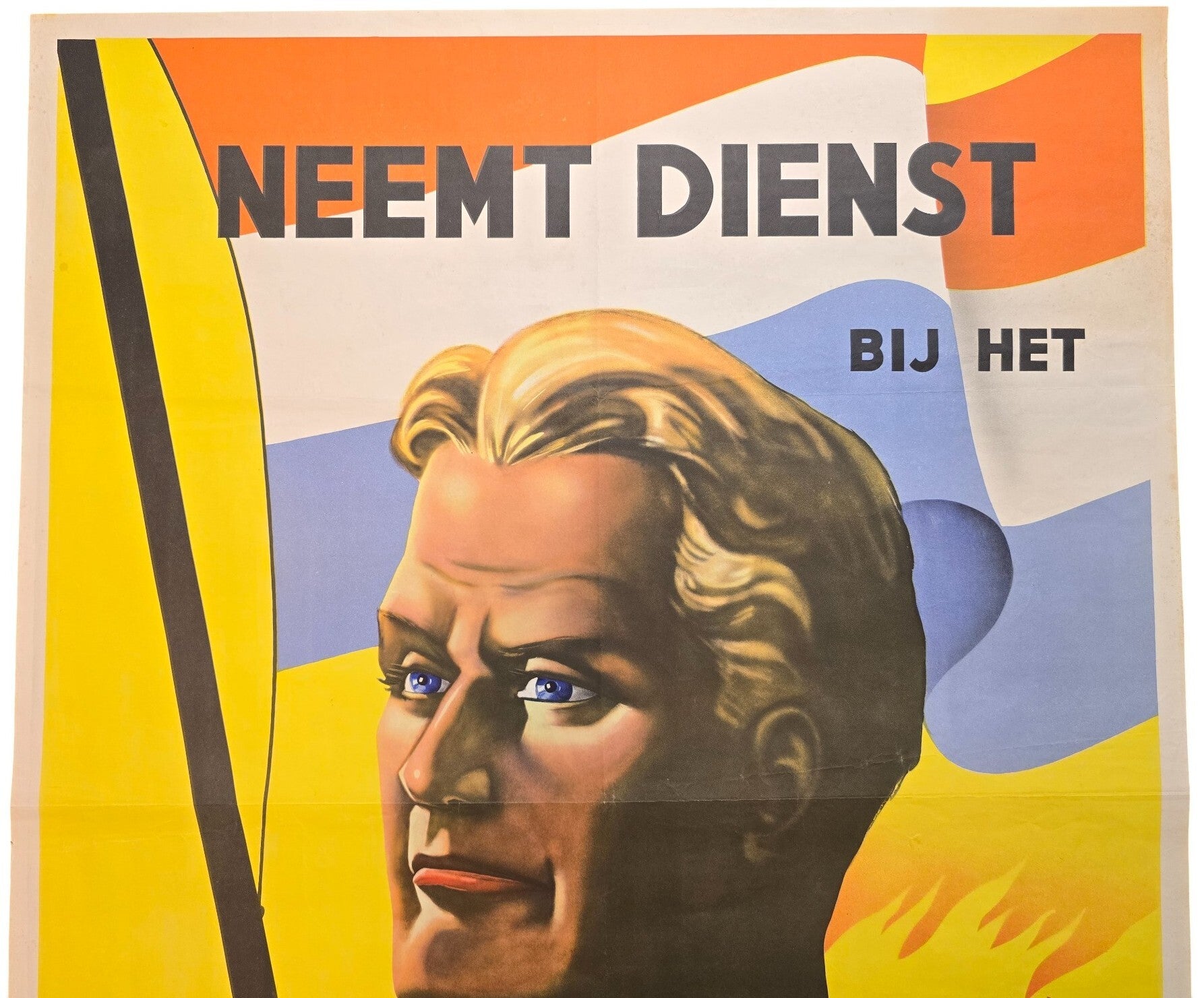 Hard to find large size early Dutch Waffen SS poster for the Vrijwilligers Legioen Nederland. The poster shows a ''aryan'' man with the Dutch Prinsenvlag behind him. In the background you can see weapons with bayonets marching right into a ''burning Soviet Union'' symbolised with the hammer and sickle and fire behind it.