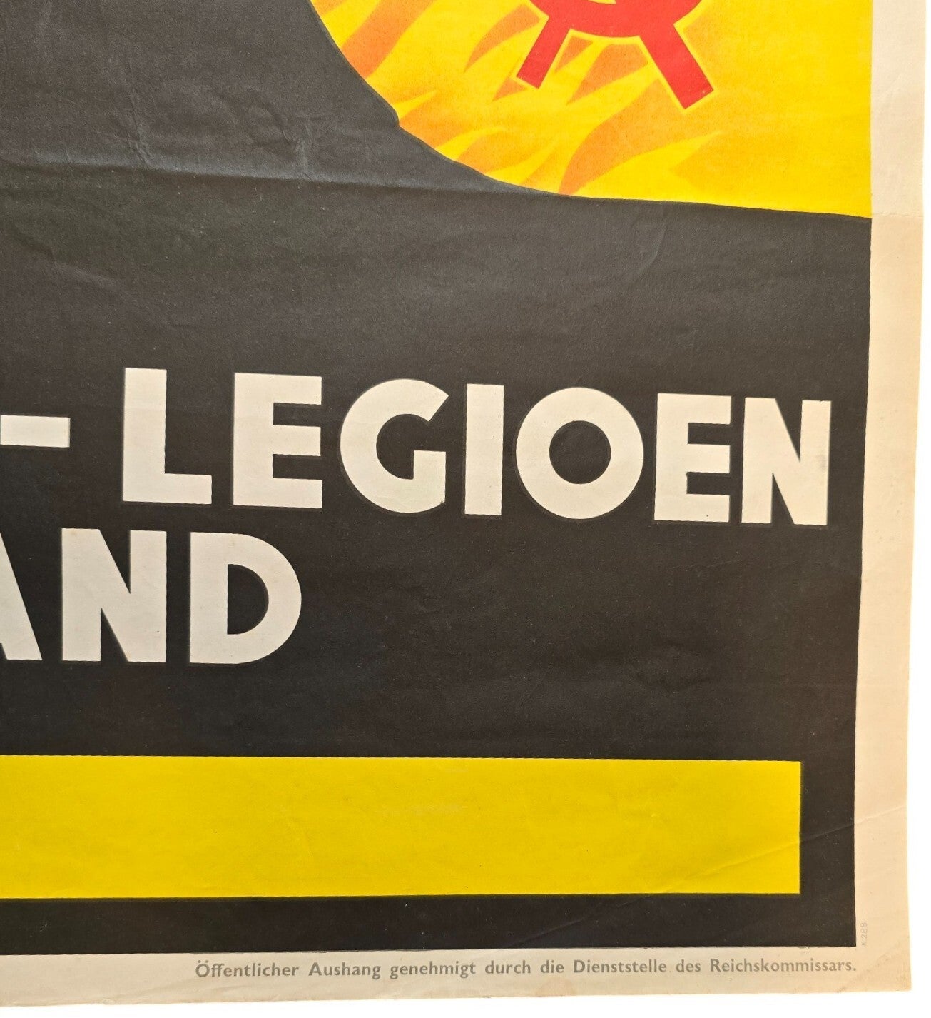 Een moeilijk te vinden, groot formaat vroege Nederlandse Waffen SS-poster van de Vrijwilligers Legioen Nederland. De poster toont een "Arische" man met de Nederlandse Prinsenvlag achter hem. Op de achtergrond zijn wapens met bajonetten te zien die recht op een "brandende Sovjet-Unie" afmarcheren, gesymboliseerd door de hamer en sikkel, dat in brand staat.