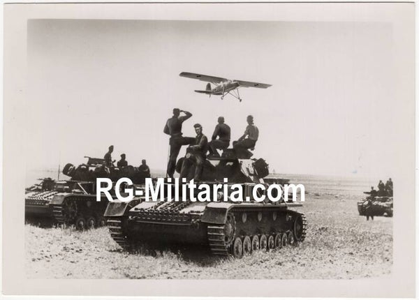 Original WW2 German Press Photo - Fieseler Storch Fi 156 airplane on the Eastern Front with Panzer Tanks