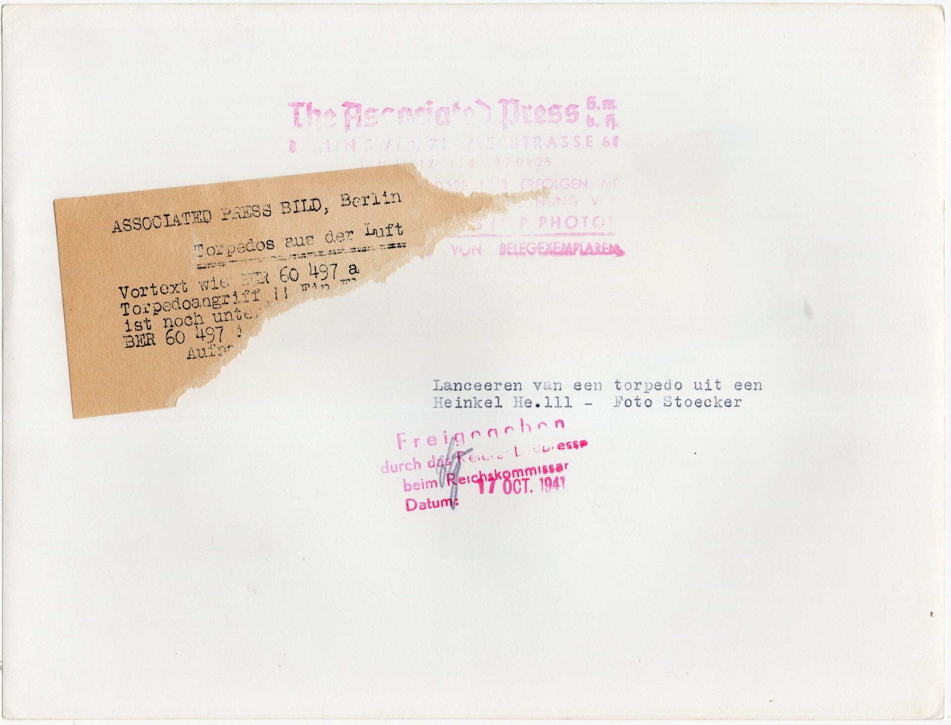 Originele Wo2 Duitse Persfoto - Luftwaffe vliegtuig Heinkel He111 laat zijn bom los (1941)