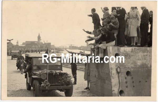 Originele Wo2 Nederlandse Bevrijding Foto - Nederlandse burgers wachten op geallieerde soldaten boven op een Duitse wegblokkering, Diemen, Nederland (1945)