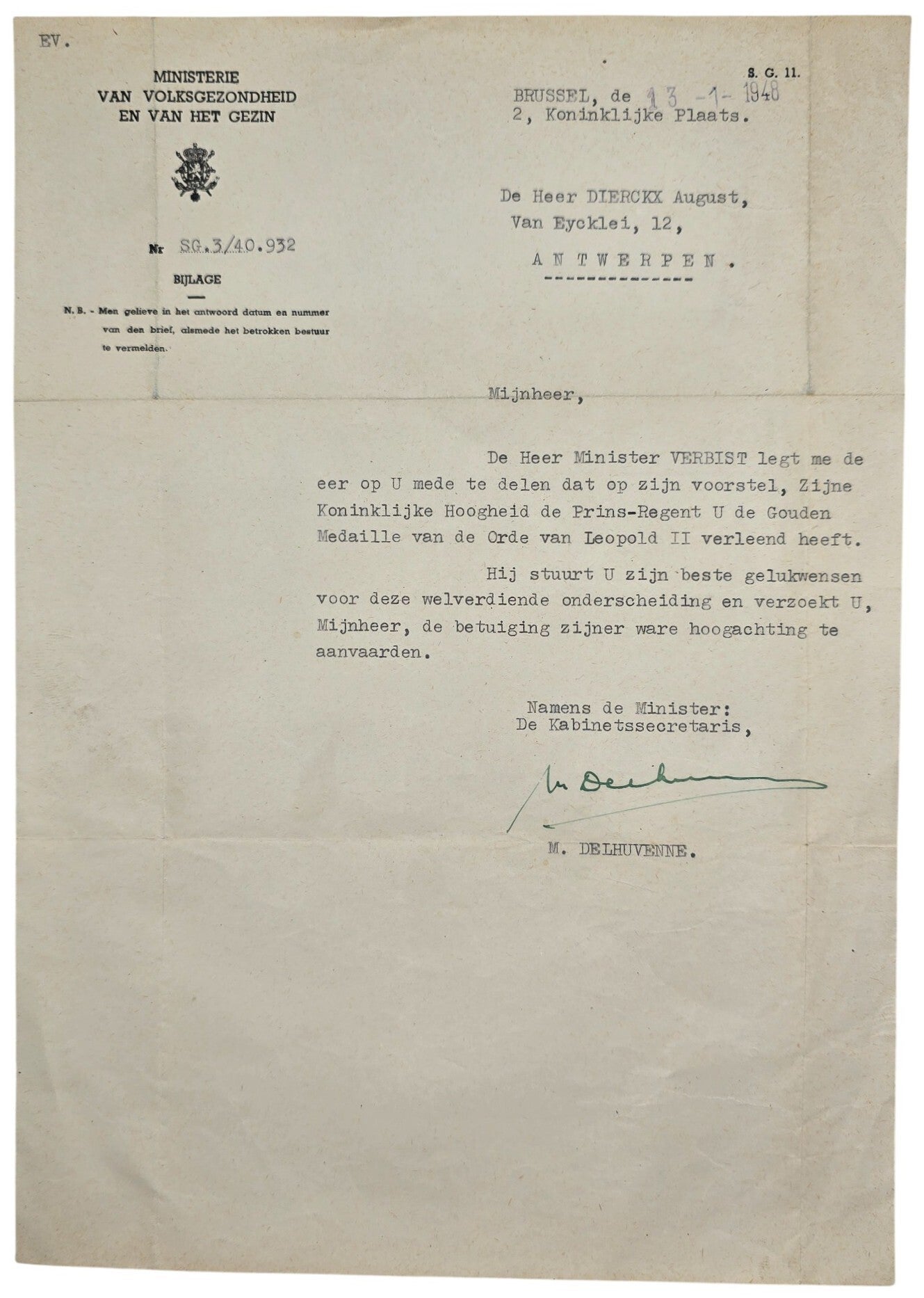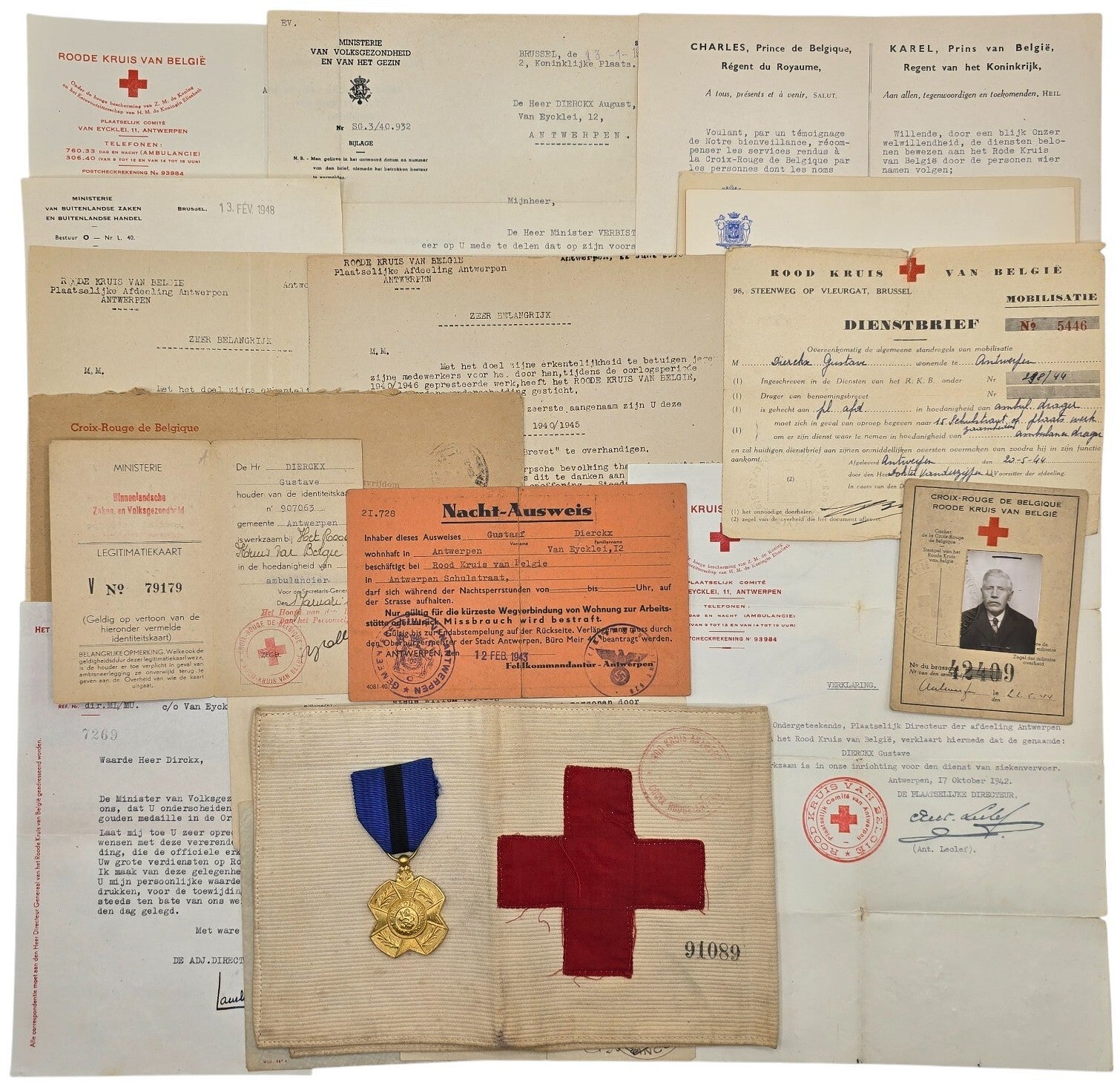 Interesting document set of the Belgian Red Cross from Antwerp from 1942 to 1948. Includes the Order of Leopold II medal. A red Cross armband, a few ID cards, and his Nacht Ausweis. Interesting set to research.