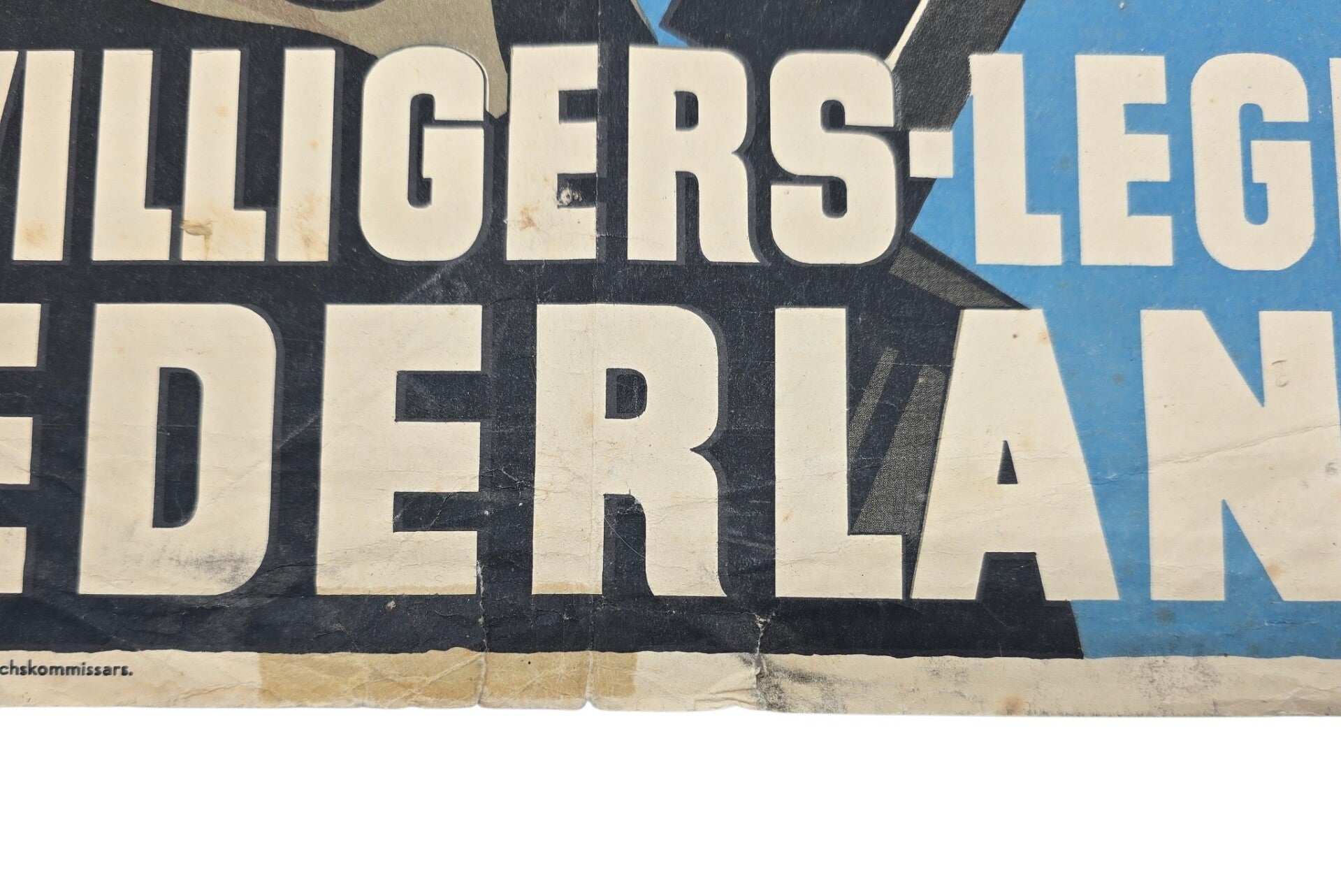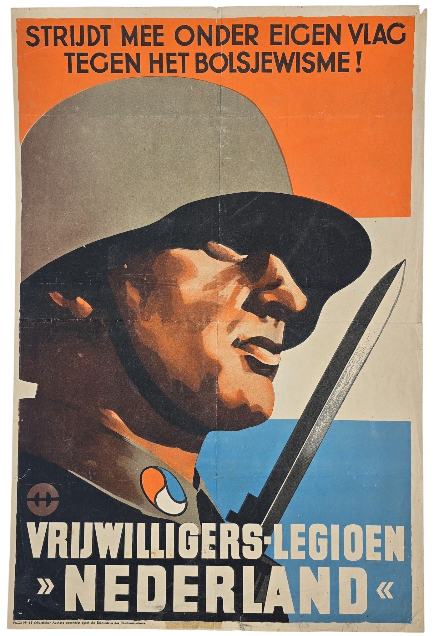 Extreem zeldzame vroege Nederlandse Waffen SS-poster voor de Vrijwilligers Legioen Nederland. De poster toont een Nederlandse soldaat met een bajonet, staand voor een Nederlands Prinsenvlag.