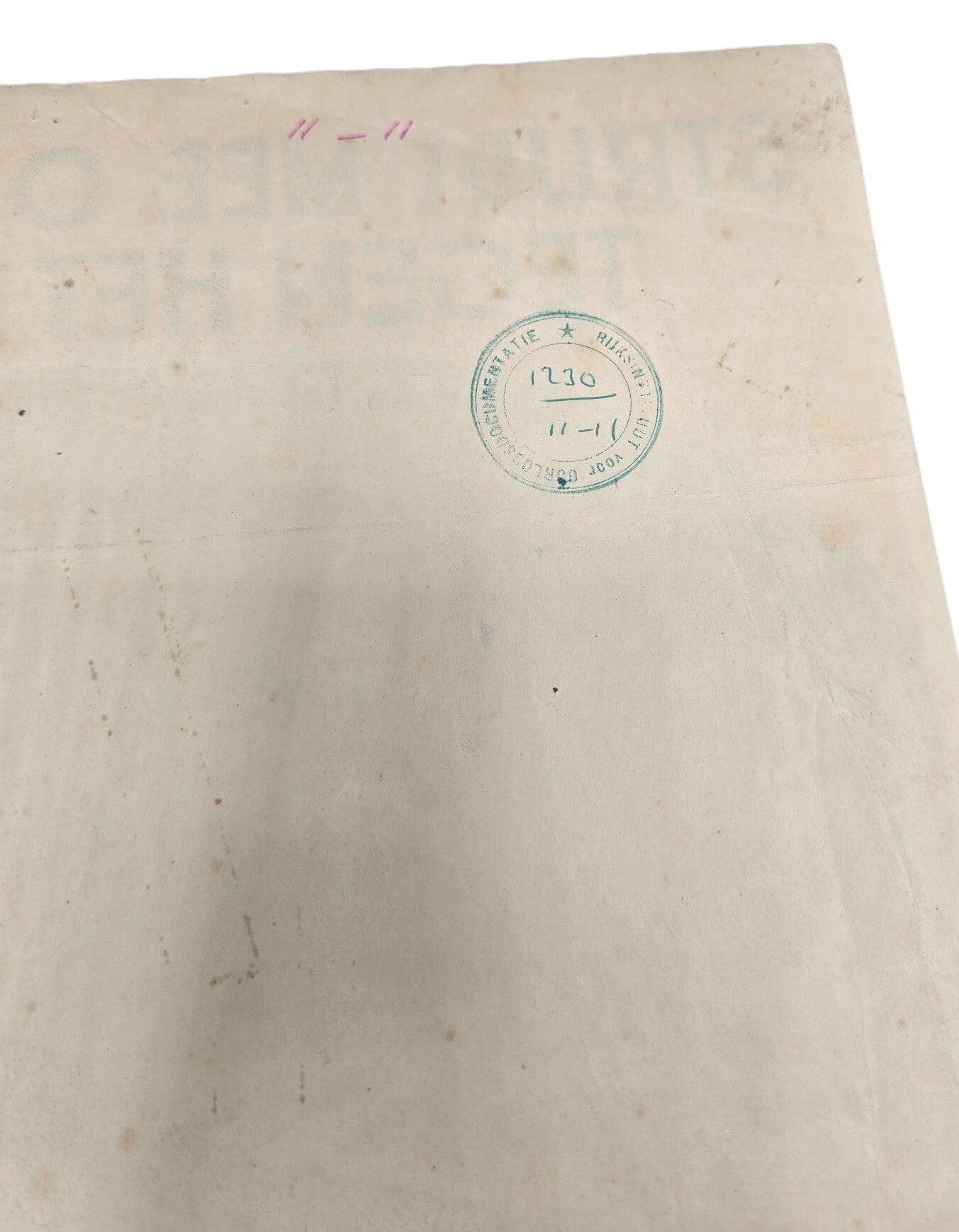 De poster is in goede staat; er zijn enkele kleine scheurtjes en gebruikssporen. Aan de onderkant zat een stukje plakband, dat inmiddels is verwijderd. Ex-libris stempels op de achterkant.