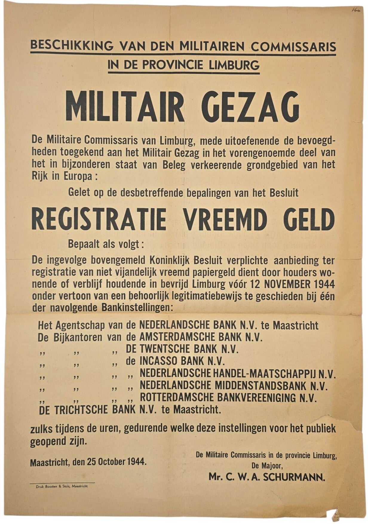 Originele Wo2 Nederlandse Bevrijding MG Poster - Militair Gezag papiergeld registreren, Maastricht (1944)