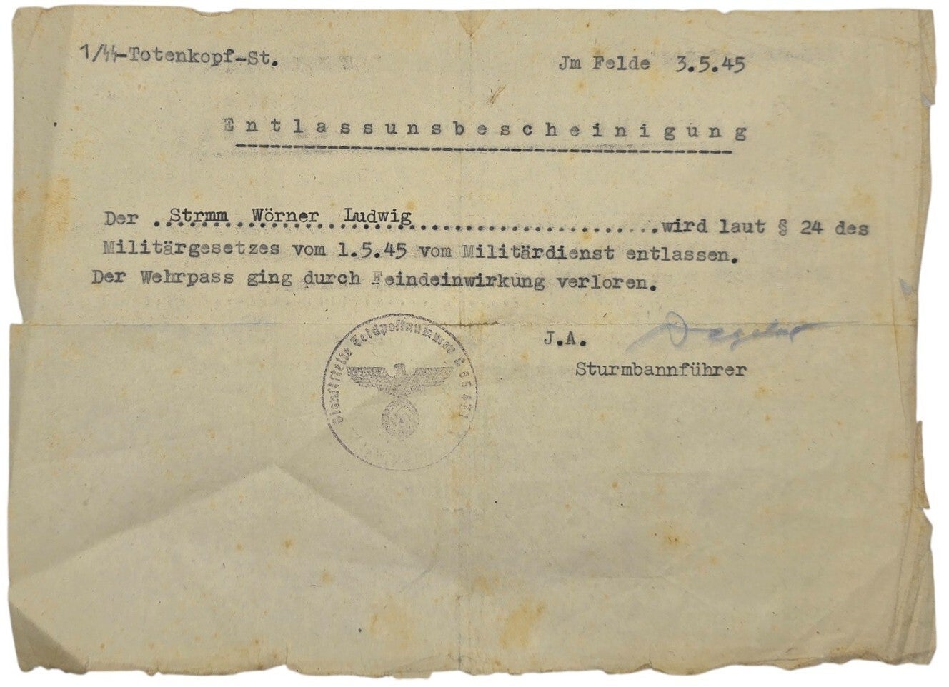 Original WW2 German Waffen SS Document - Entlassungsbescheinigung 1 SS Totenkopf St. (1945)