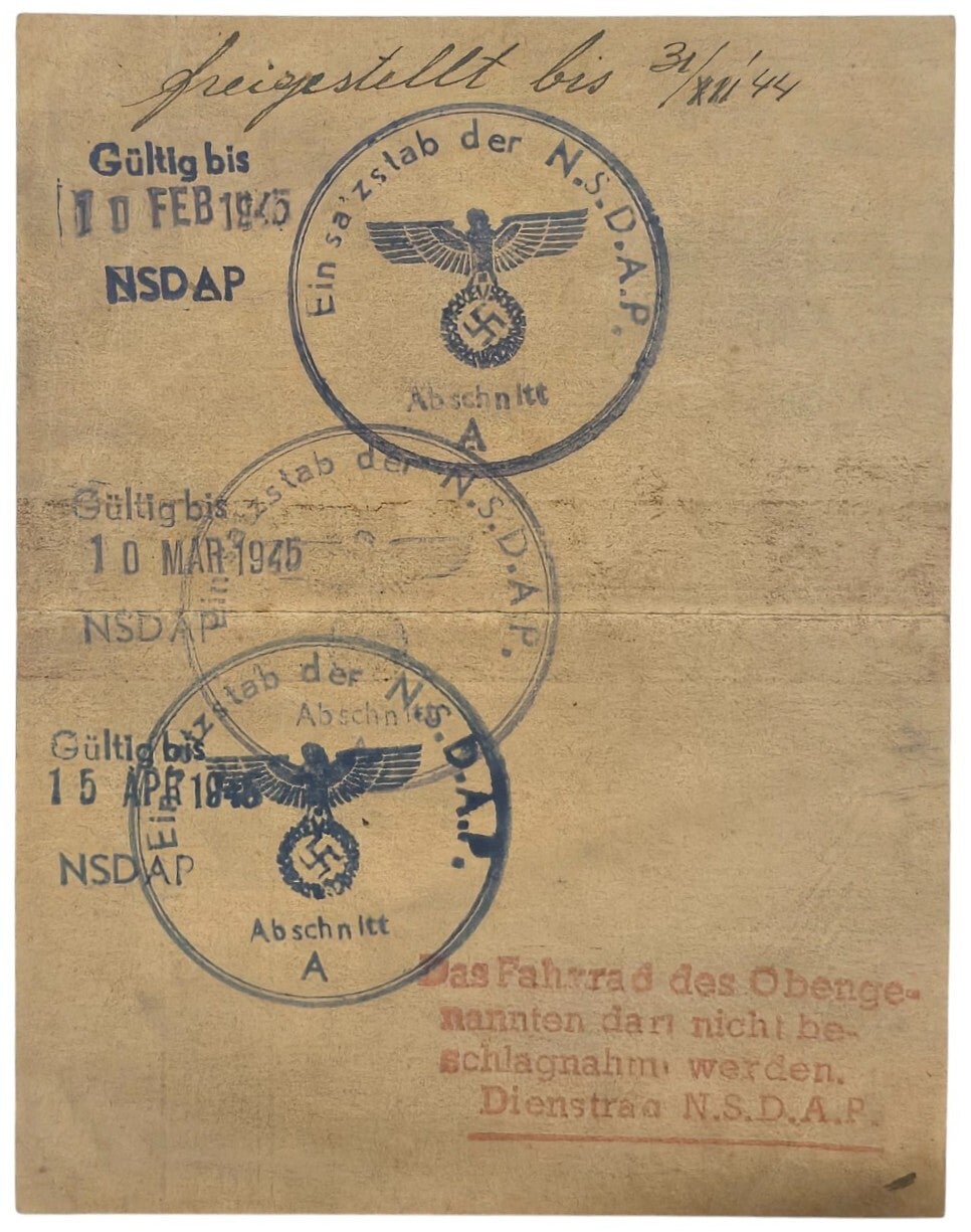 Original WW2 Dutch Document - Freistellungs Bescheinigung Einsatzstab NSDAP Abschnitt Nord, Amersfoort (1945)