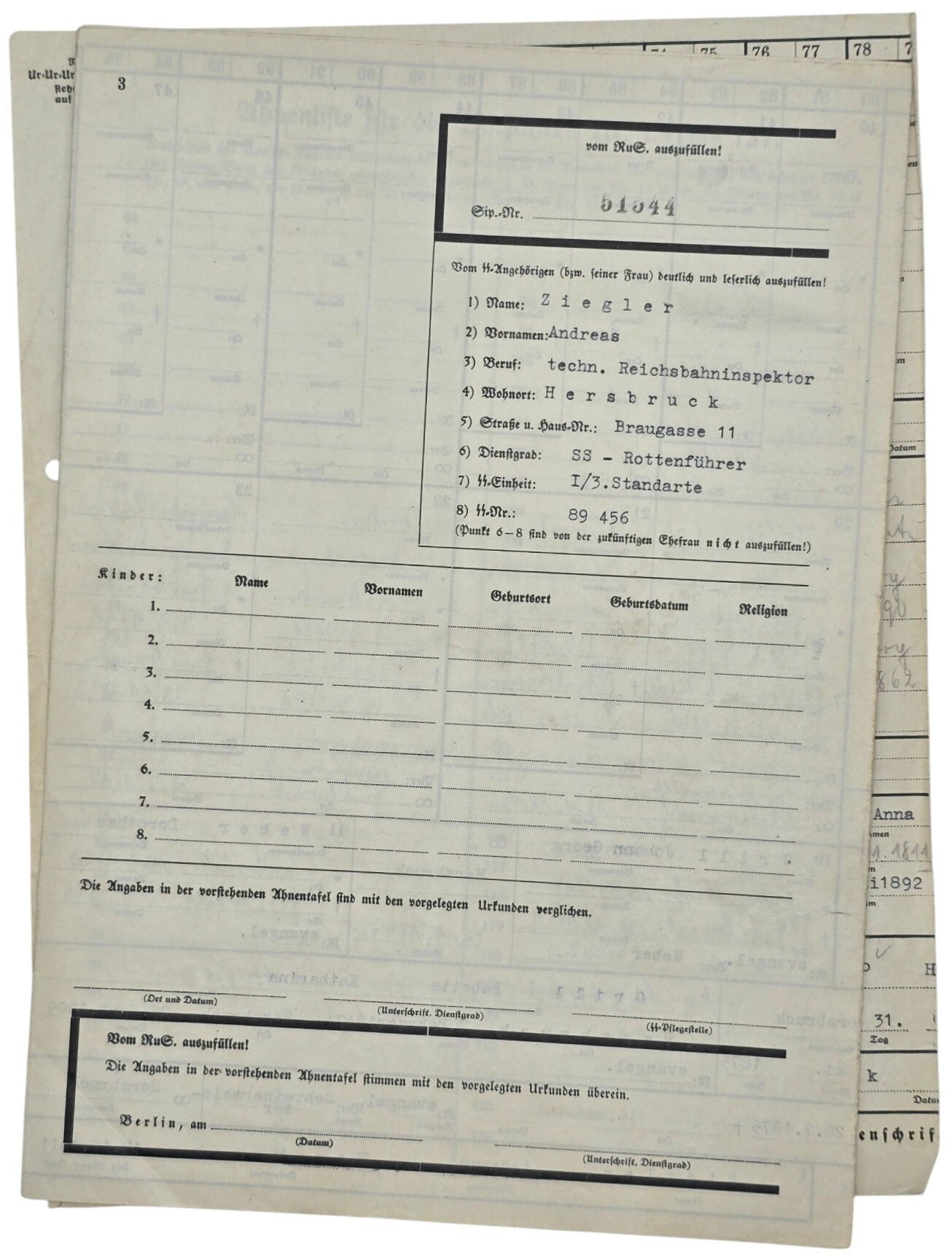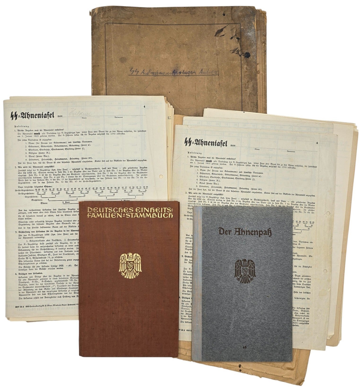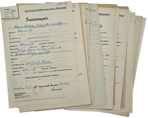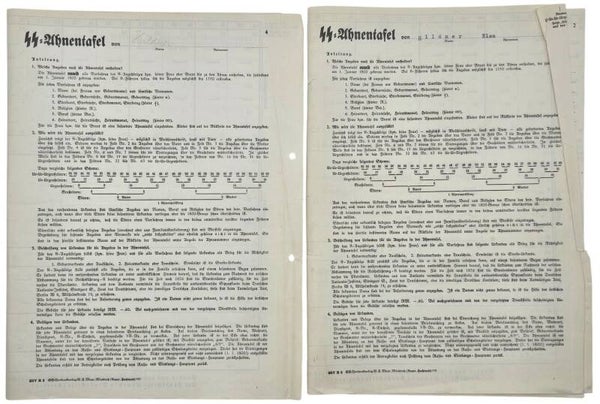 Interessante verzameling documenten van SS 3. Standarte-militair Andreas Ziegler en zijn vrouw Else Hildner. Het paar wilde trouwen, maar onderging vóór het huwelijk een stamboomonderzoek om te controleren of beiden van Arische afkomst waren, zoals vereist door de SS. Deze verzameling bevat 3 SS-Ahnentafels, een Ahnenpass en een Familien-stammbuch. Daarnaast zijn er circa 70 certificaten uit de archieven die de Arische afkomst van beiden bewijzen.