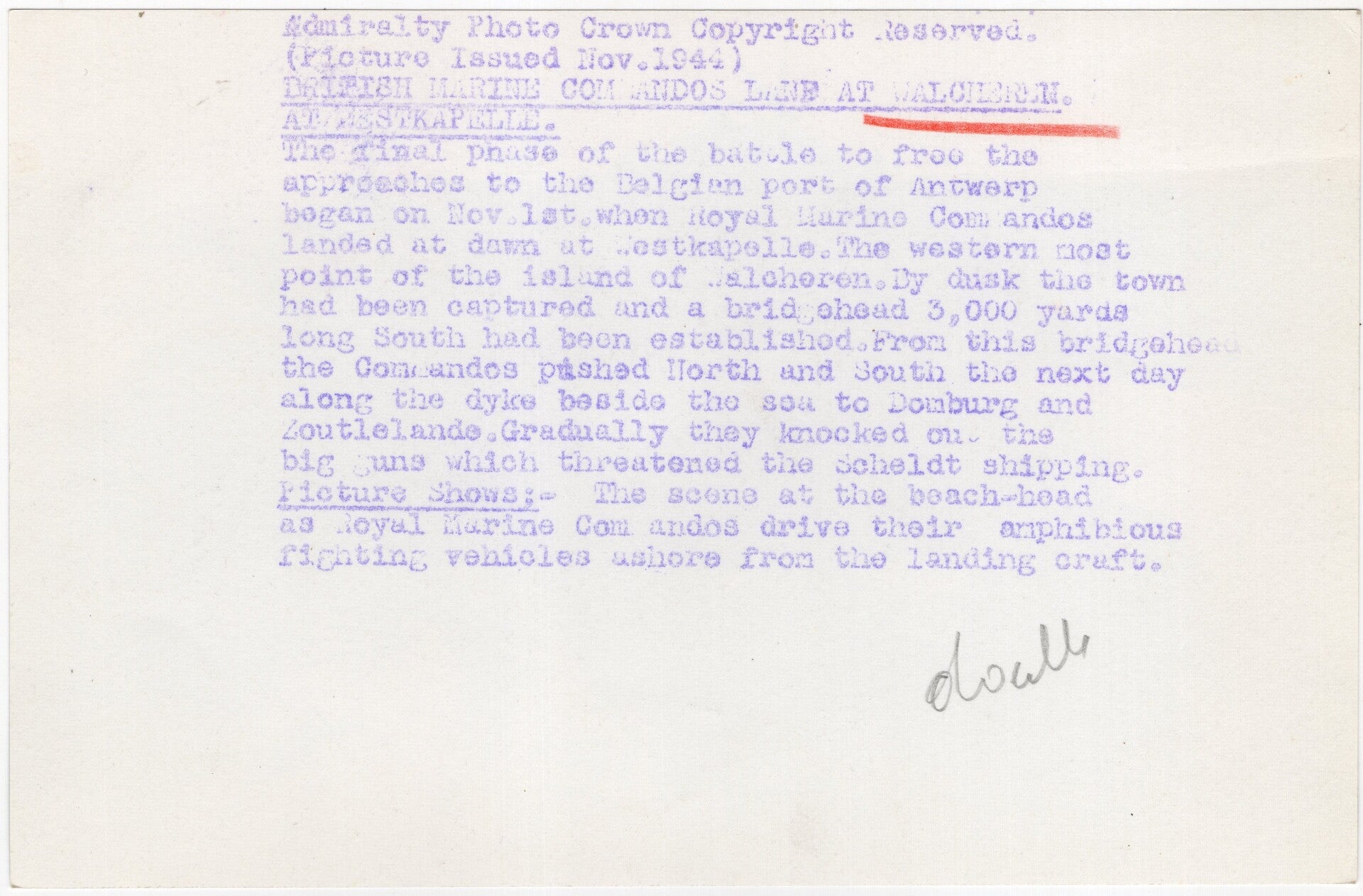Originele Wo2 Britse Persfoto - Britse Marine Commando-troepen landen op Walcheren, Westkapelle, Nederland (1944)