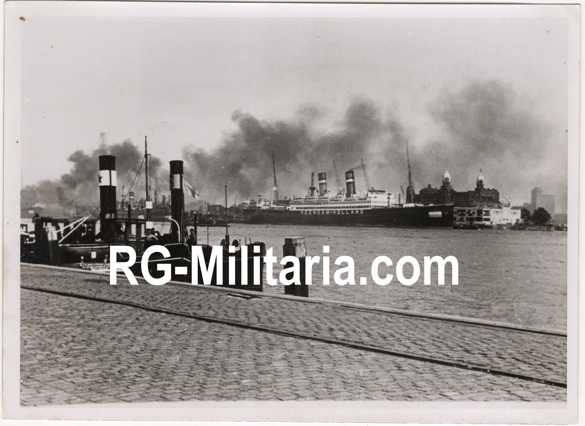 Original WW2 German Press Photo - Veendam ship in front of burning Rotterdam, Holland during the bombing of May (1940)