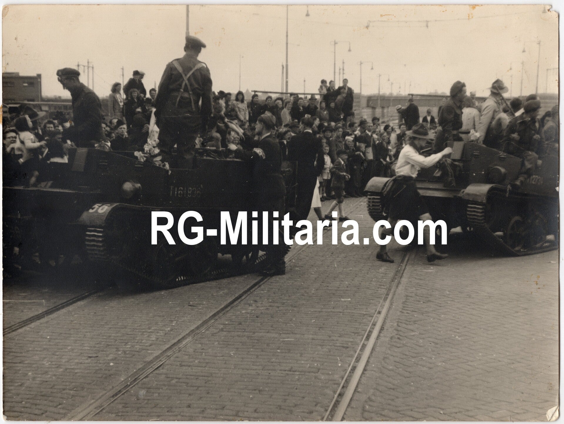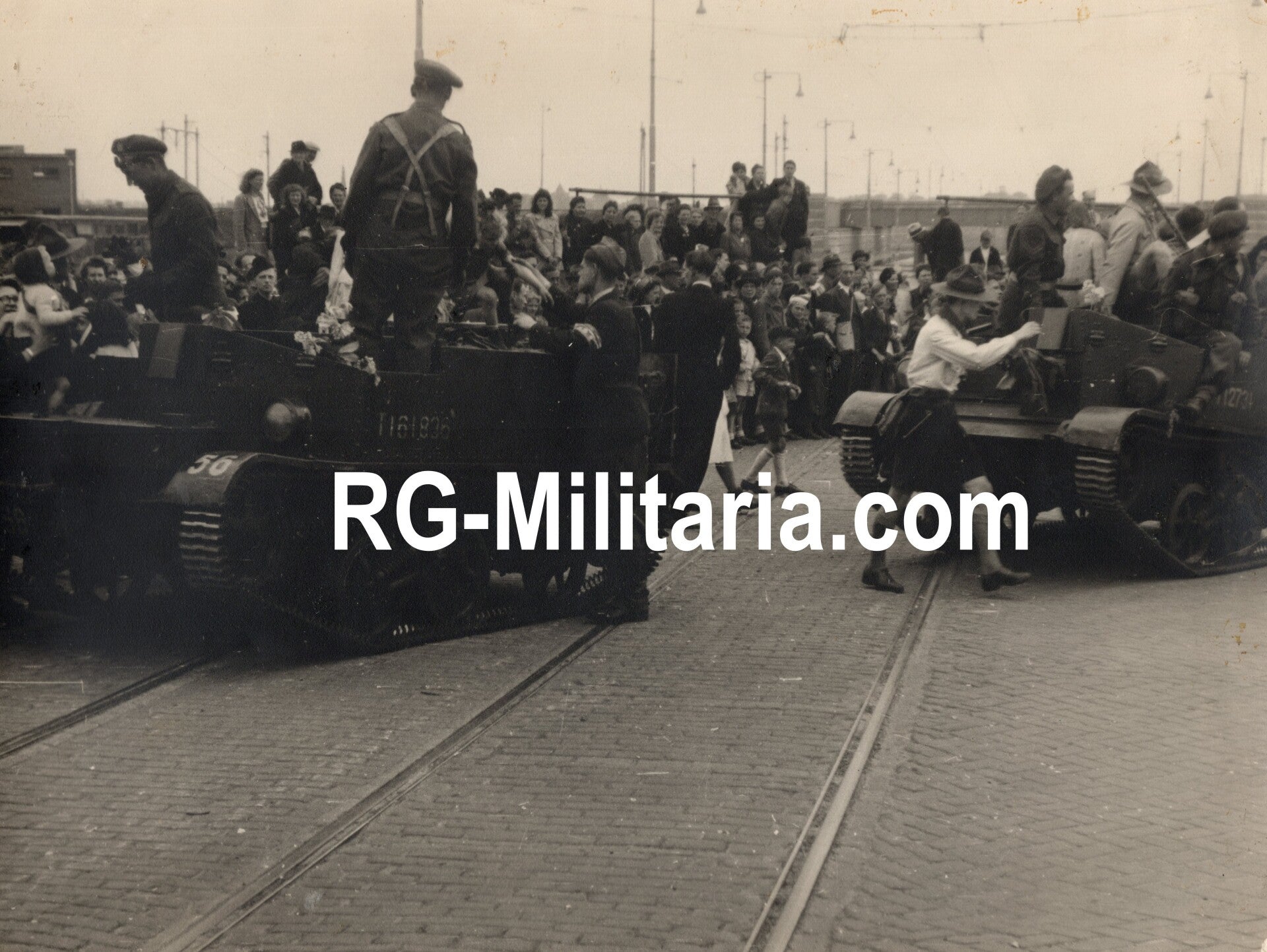 Original WW2 Dutch Liberation Press Photo - Canadians in Bren Gun Carriers liberate Amsterdam, Holland (1945)