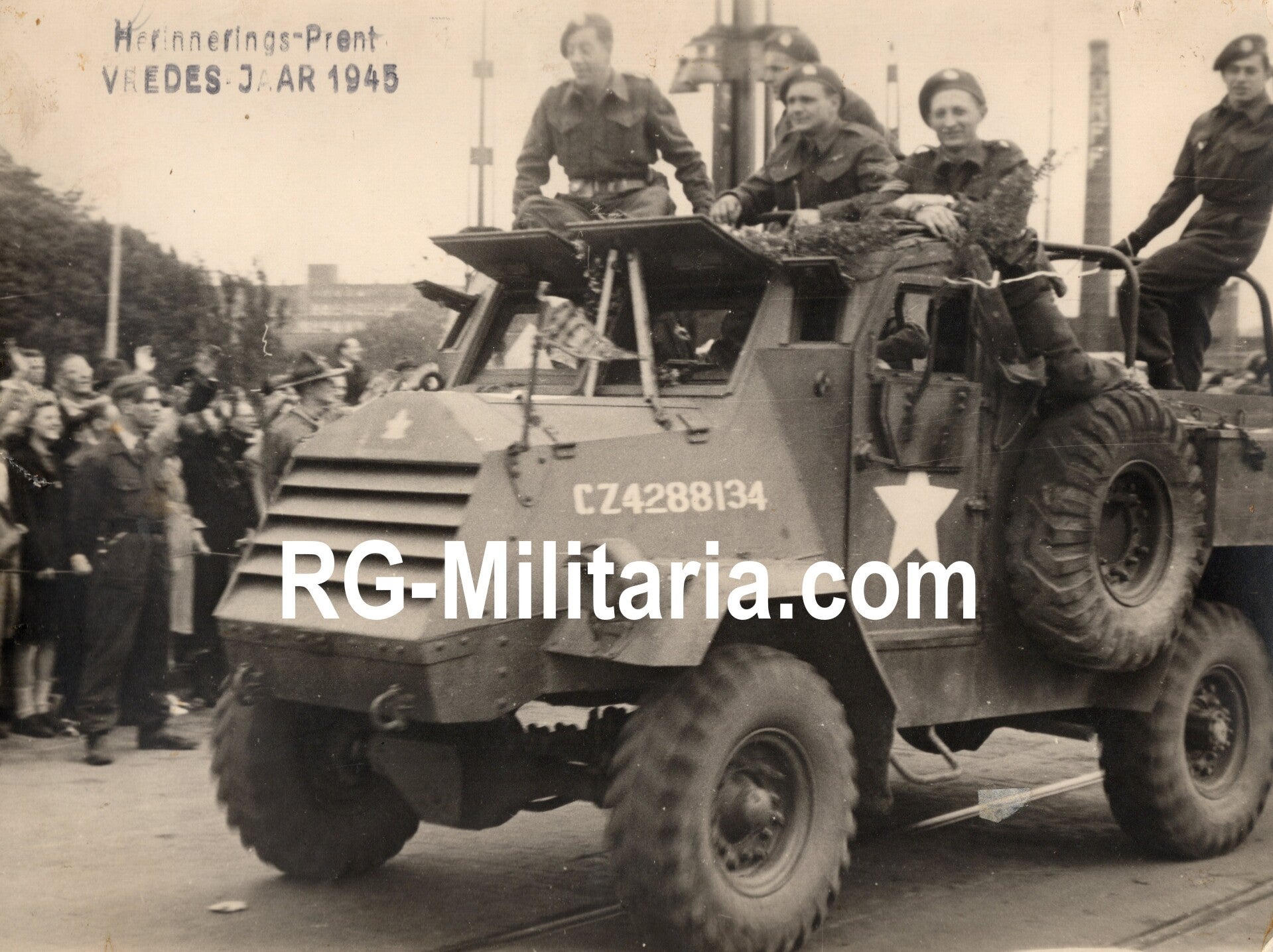 Originele Wo2 Nederlandse Bevrijdings Persfoto - Canadezen in een panzerwagen bevrijden Amsterdam, Nederland (1945)