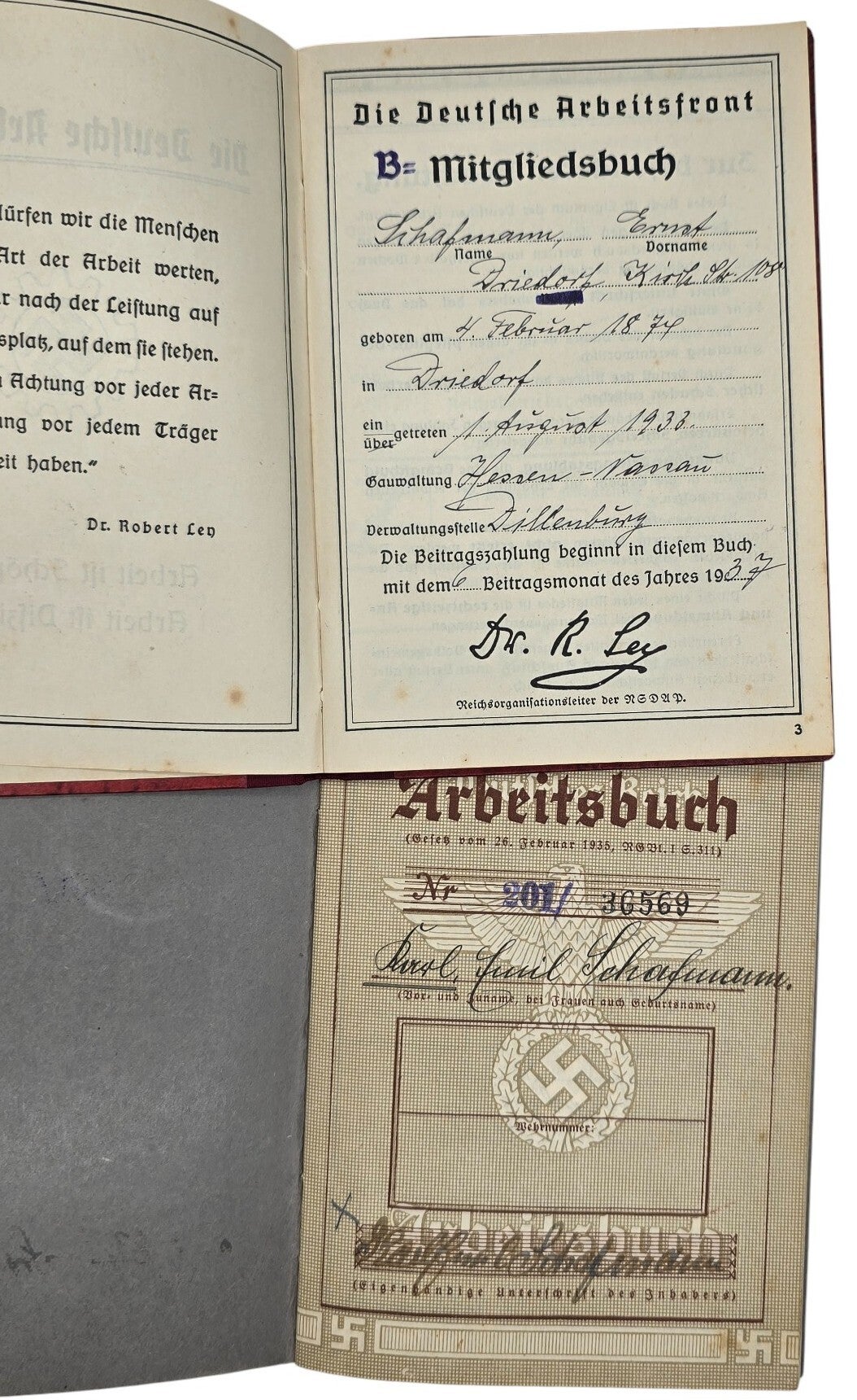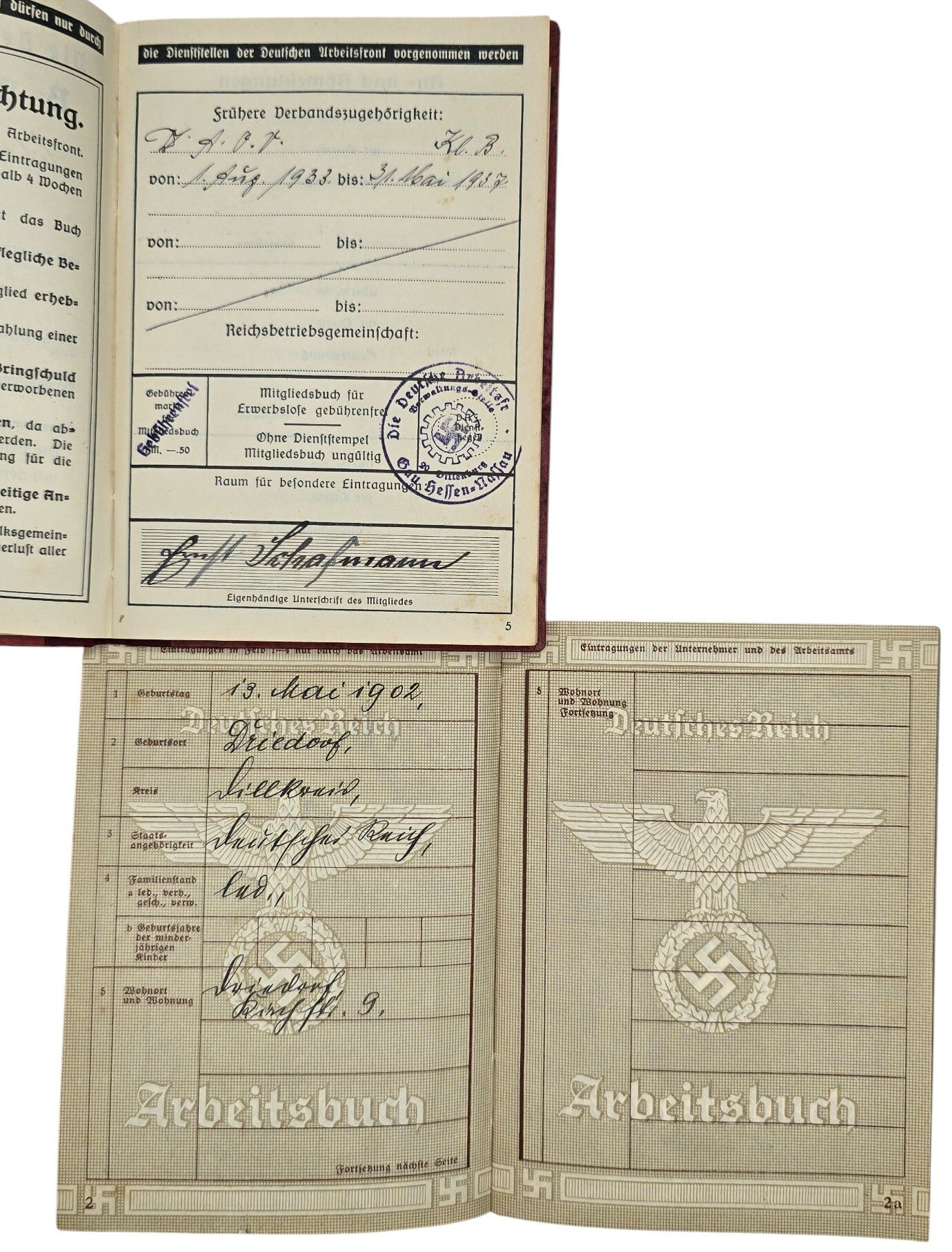 Original WW2 German Document - Arbeitsbuch and DAF Mitgliedsbuch set Dillenburg (1937 1939)
