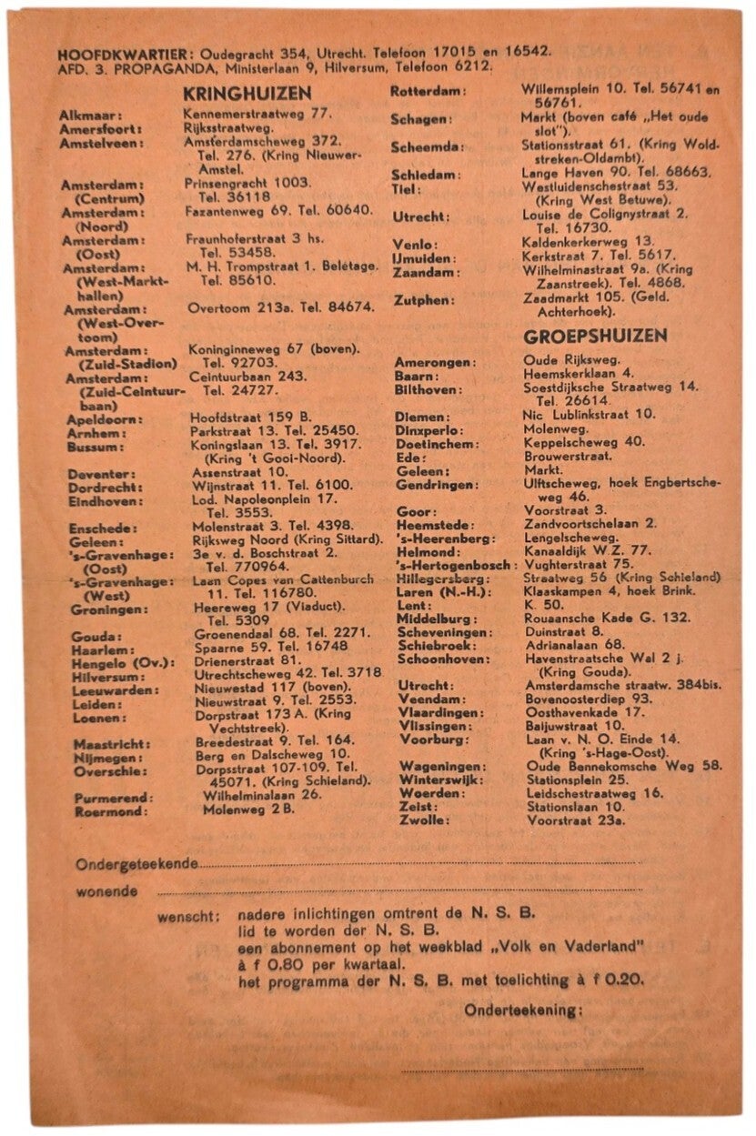 Nederlandse collaboratie flyer van de NSB. In de flyer staat onder andere het NSB programma.