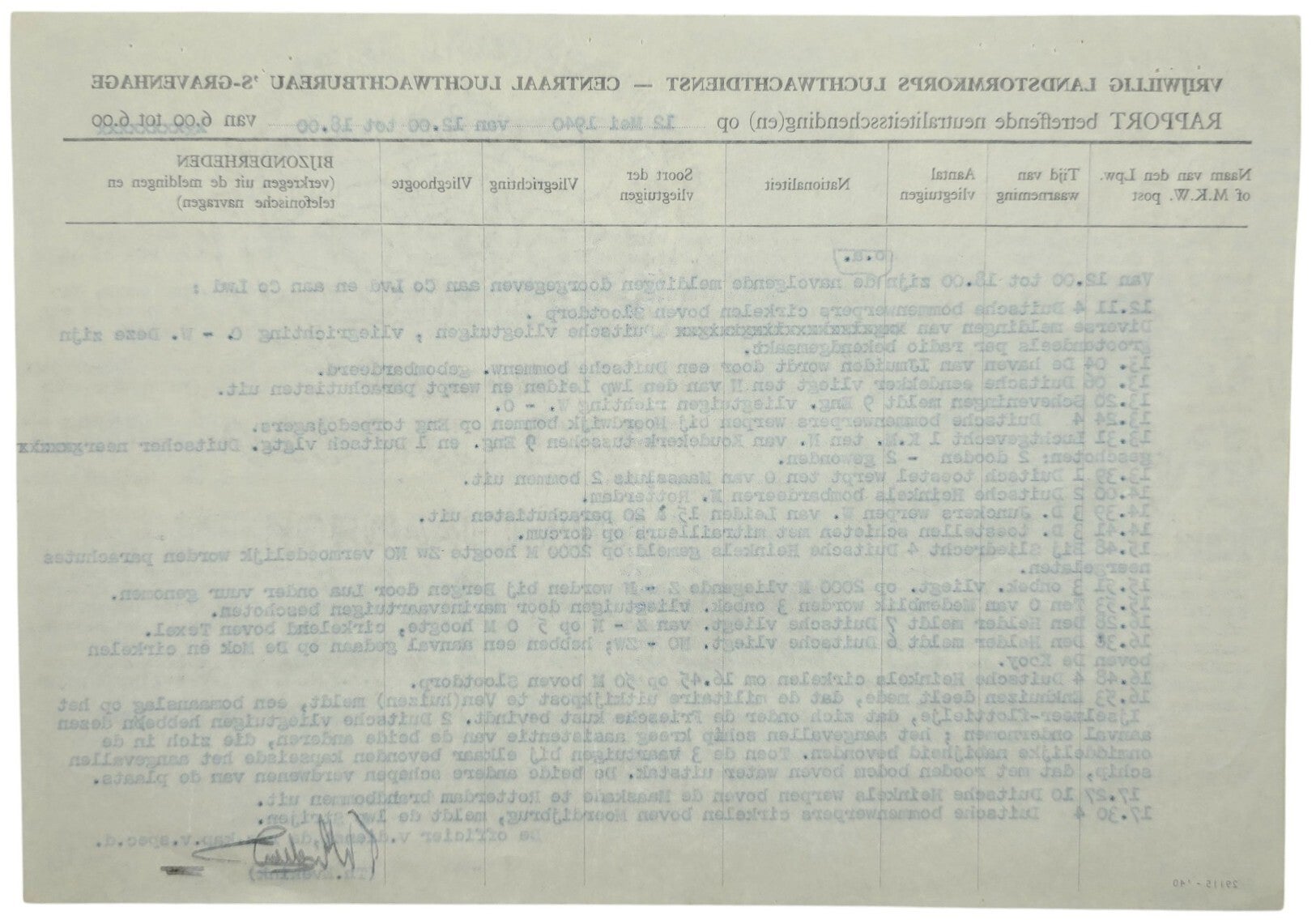 Interessant document van het Vrijwillige Landstormkorps Luchtwachtdienst op het bureau in Den Haag ('s Gravenhage) dat berichtte over de Duitse invasie van Nederland door de lucht. Deze zijn getimed met wat de groepen gedurende de periode hebben gezien, zoals neerstortende vliegtuigen en schieten in verschillende gebieden. Ook werden waarnemingen van Fallschirmjägers gemeld.