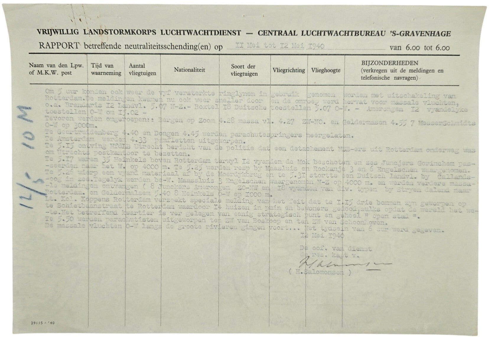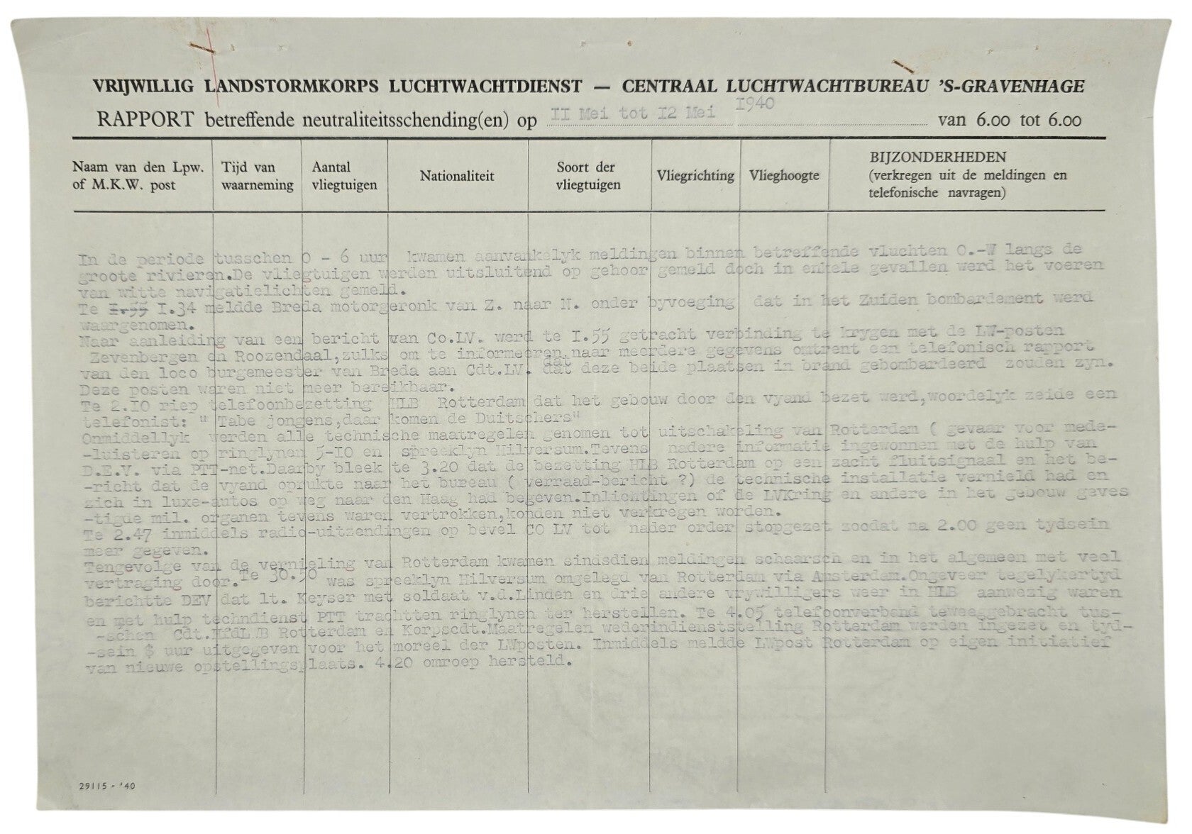 Interessant document van het Vrijwillige Landstormkorps Luchtwachtdienst op het bureau in Den Haag ('s Gravenhage) dat berichtte over de Duitse invasie van Nederland door de lucht. Deze zijn getimed met wat de groepen gedurende de periode hebben gezien, zoals neerstortende vliegtuigen en schieten in verschillende gebieden. Ook werden waarnemingen van Fallschirmjägers gemeld.