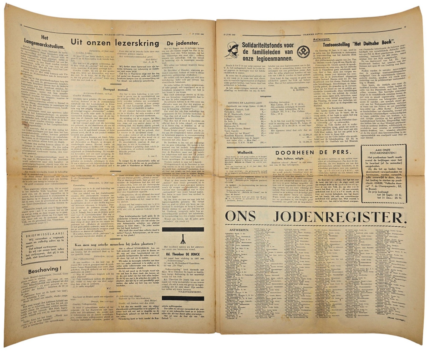 Antisemitic newspaper ''Volksche Aanval'' by the Flemish antisemitic action group Volksverwering led by René Lambricht. This newspaper is a Flemish variant of the German Der Stürmer by Julius Streicher. From 1942, they published lists of names and addresses of Jewish inhabitants in Belgium, to get them arrested, deported, and then murdered.