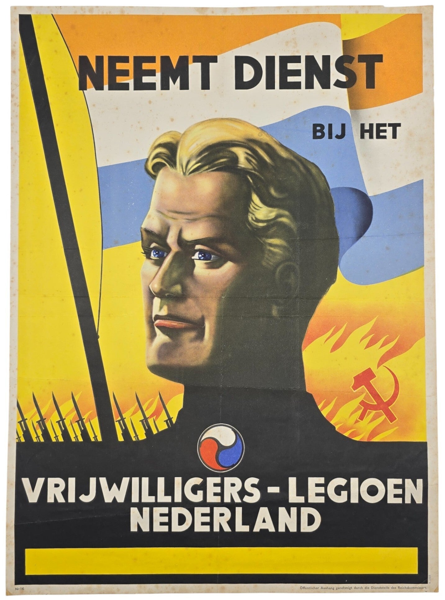 Early Dutch Waffen SS poster for the Vrijwilligers Legioen Nederland. The poster shows a ''aryan'' man with the Dutch Prinsenvlag behind him. In the background, you can see weapons with bayonets marching right into a ''burning Soviet Union'' symbolised with the hammer and sickle and fire behind it.