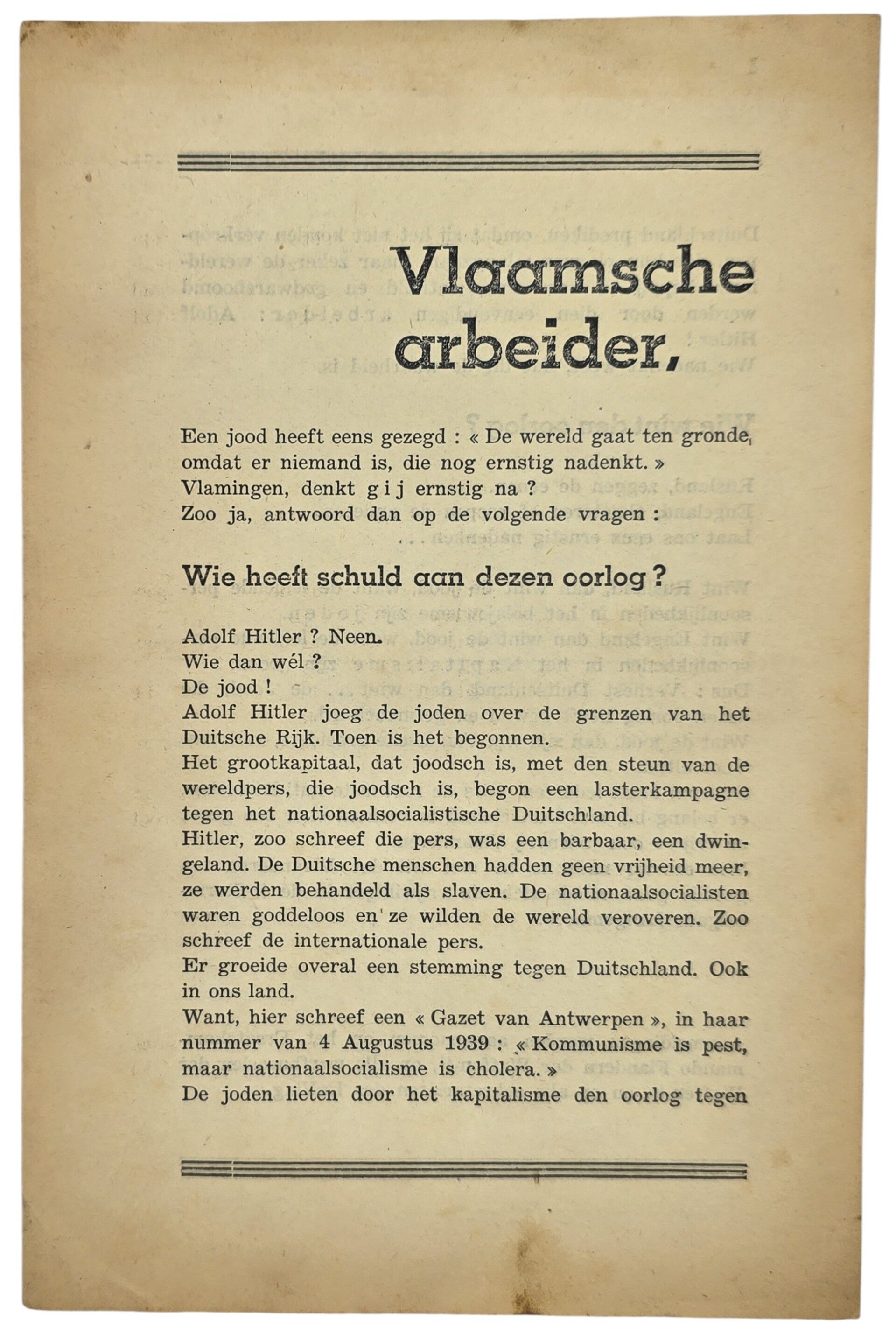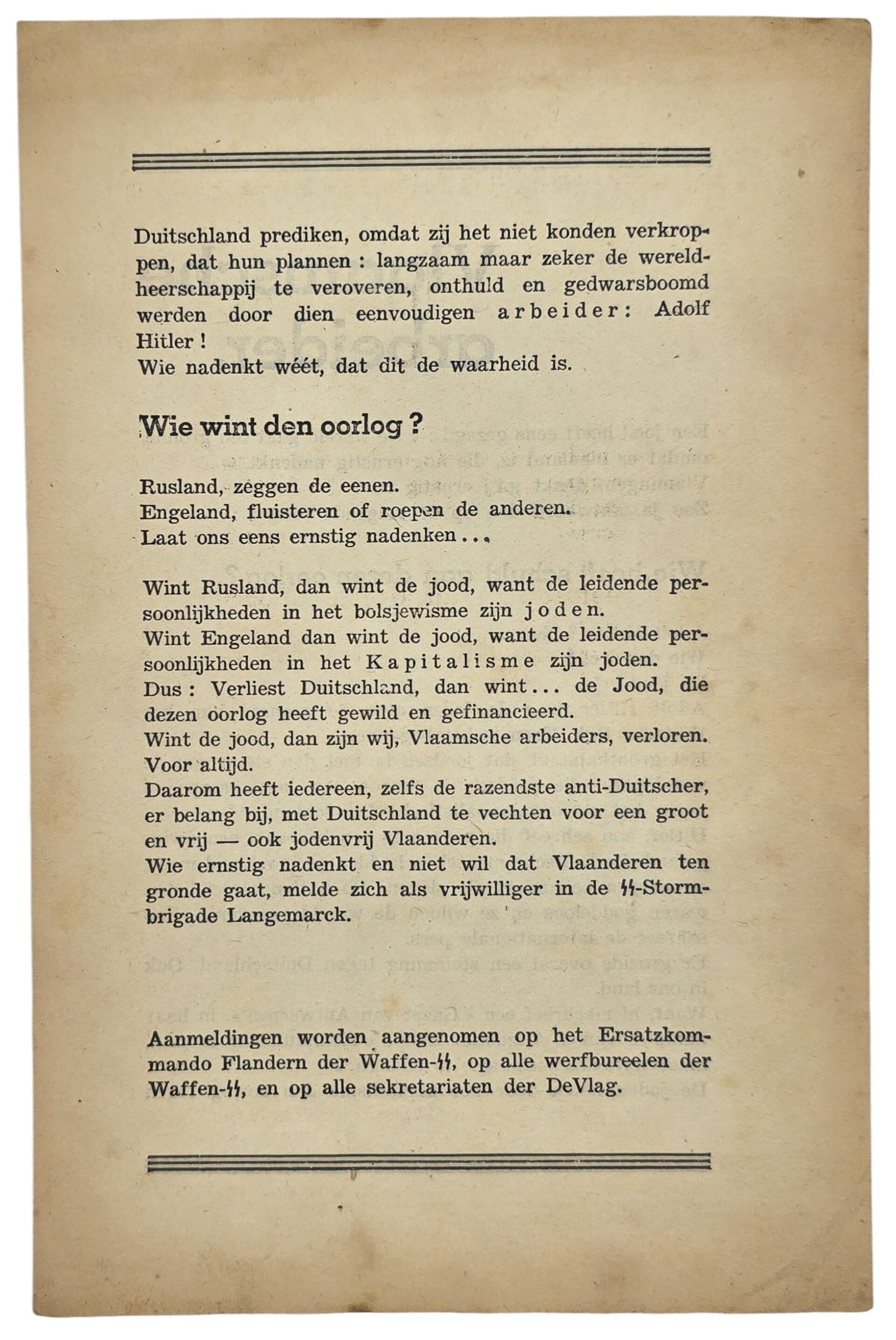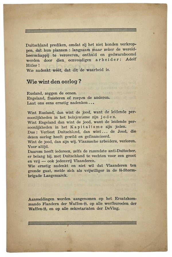 Rekruteringsflyer voor de Vlaamse Waffen SS. DeVlag. Antisemitisch.