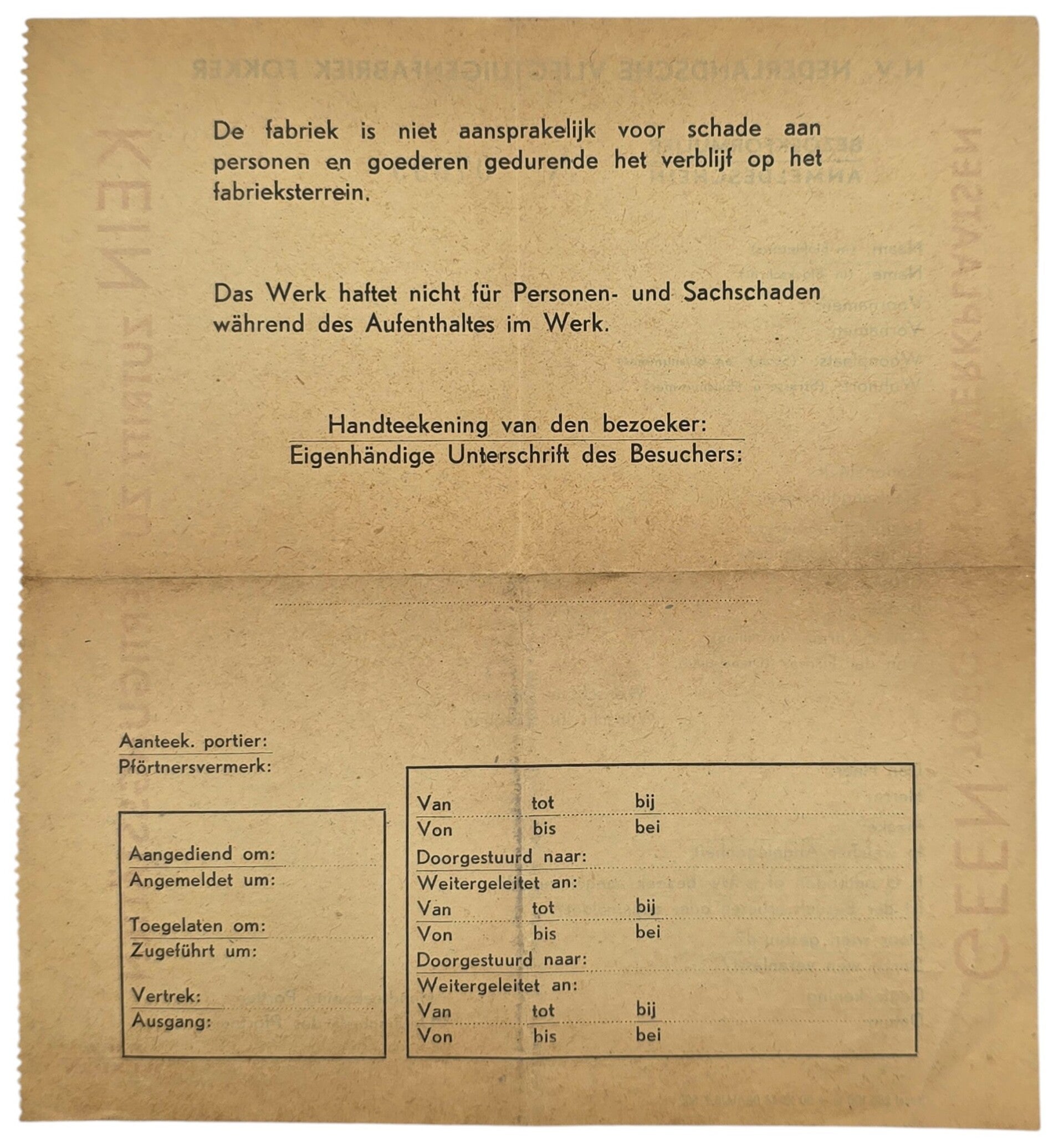 Origineel Wo2 Nederlands Document - NV Nederlandsche Vliegtuigenfabriek Fokker Bezoekformulier, Amsterdam (1943)