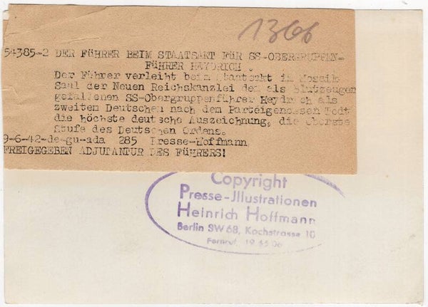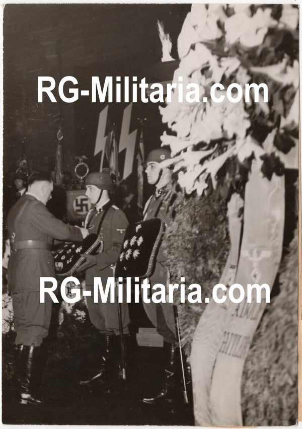 Original WW2 German Waffen SS Press Photo - Adolf Hitler posthumously awarding SS-Obergruppenführer Reinhard Heydrich the Deutscher Orden der NSDAP during his funeral, Berlin (1942)