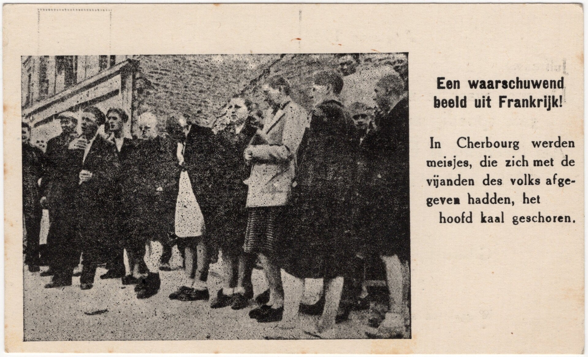 Dreigende boodschap aan vrouwen die contact hadden gehad met Duitse soldaten, met afbeeldingen van geschoren vrouwen in Cherbourg, Frankrijk.