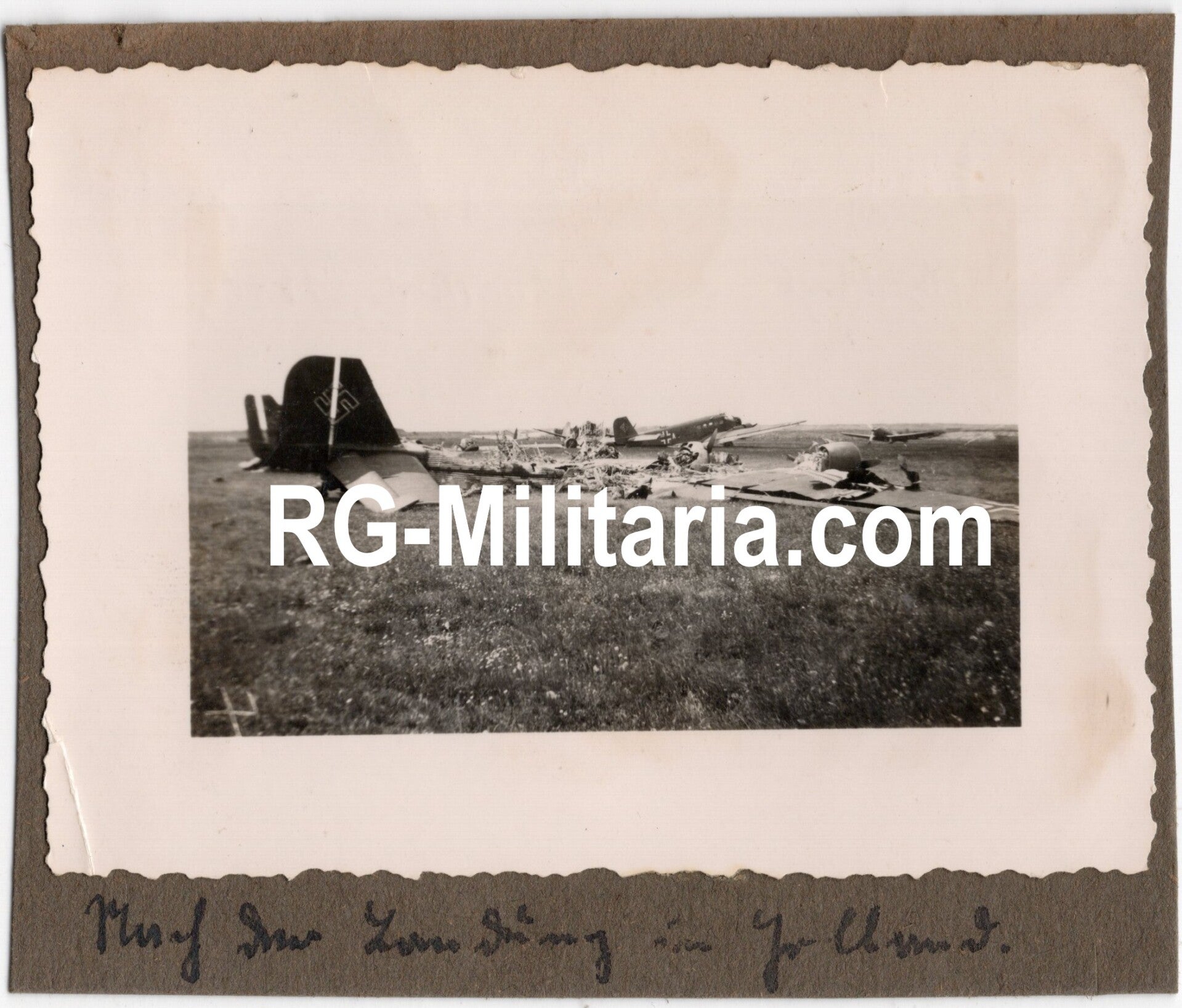 Originele Wo2 Duitse Foto - Rotterdamse vliegveld Waalhaven met vernietigde Junker JU52 vliegtuigen, Nederland (1940)
