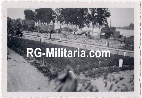 Originele Wo2 Duitse Foto - Duitse militairen rijden langs vernietigde huizen bij Moerdijk, Rotterdam, Nederland, Mei (1940)