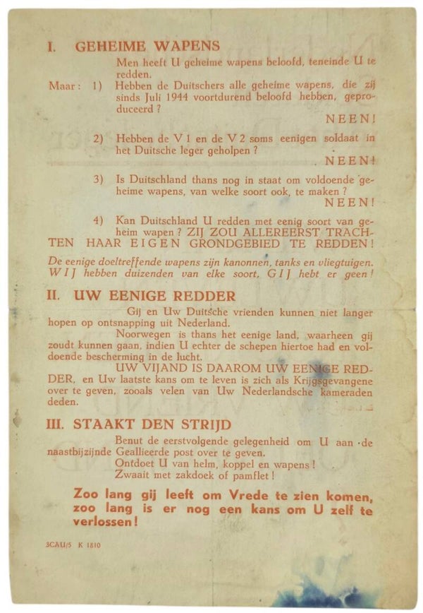 Origineel Wo2 Brits Pamflet - 3CAU/5 K1810 ''Nederlandse soldaten in het Duitse leger!'' (1945)