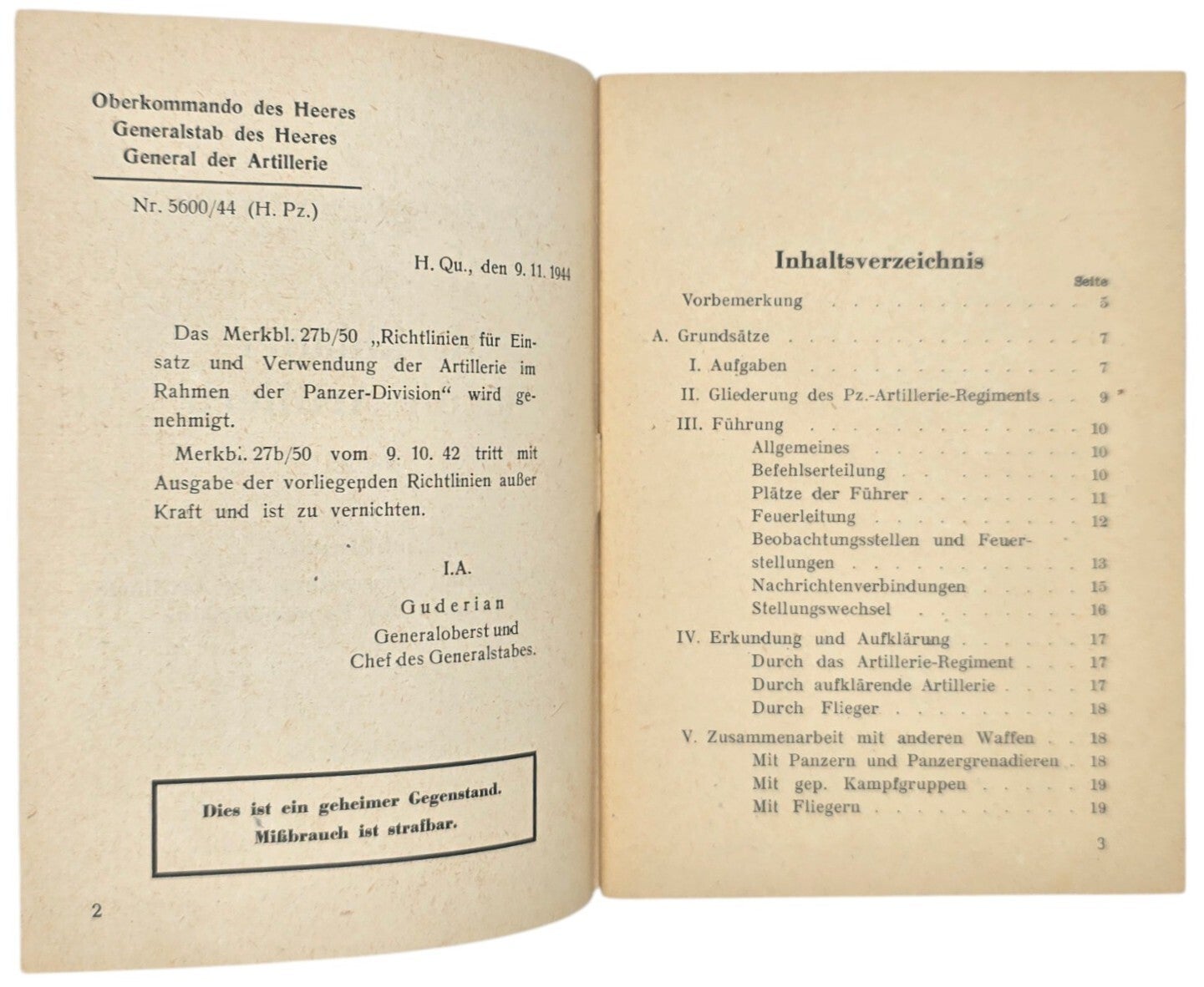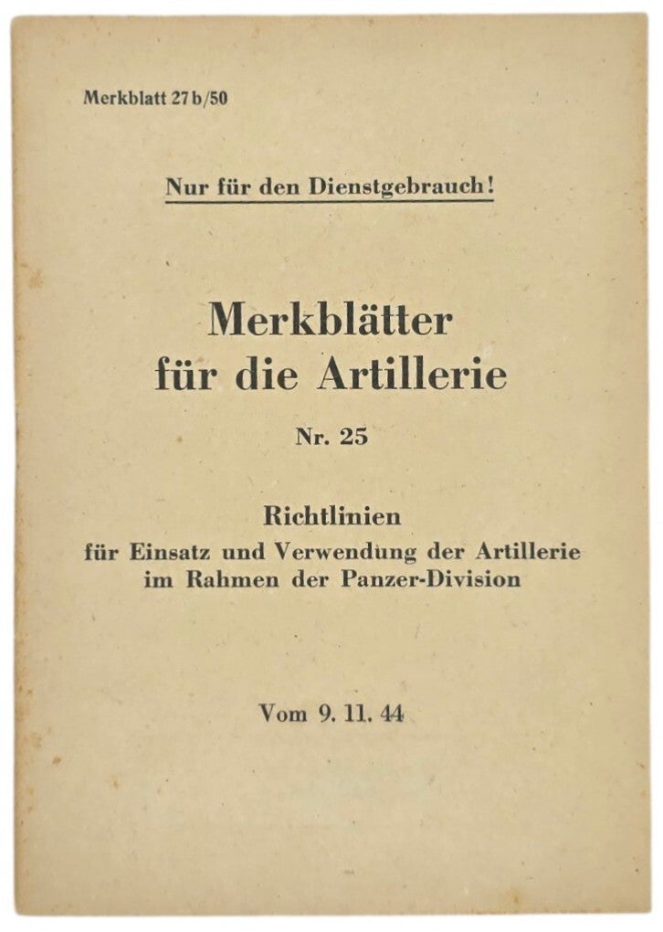 Original WW2 German Brochure - 27b/50 Merkblätter für Artillerie Nr. 25, Richtlinien für Einsatz und Verwendung der Artillerie im Rahmen der Panzer-Division (1944)