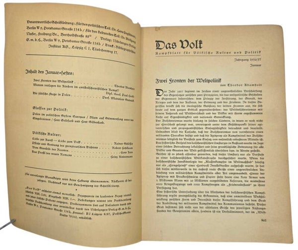 Origineel Wo2 Duits Tijdschrift - Das Volk Kampfblatt für Völkische Kultur und Politik Januar (1936)