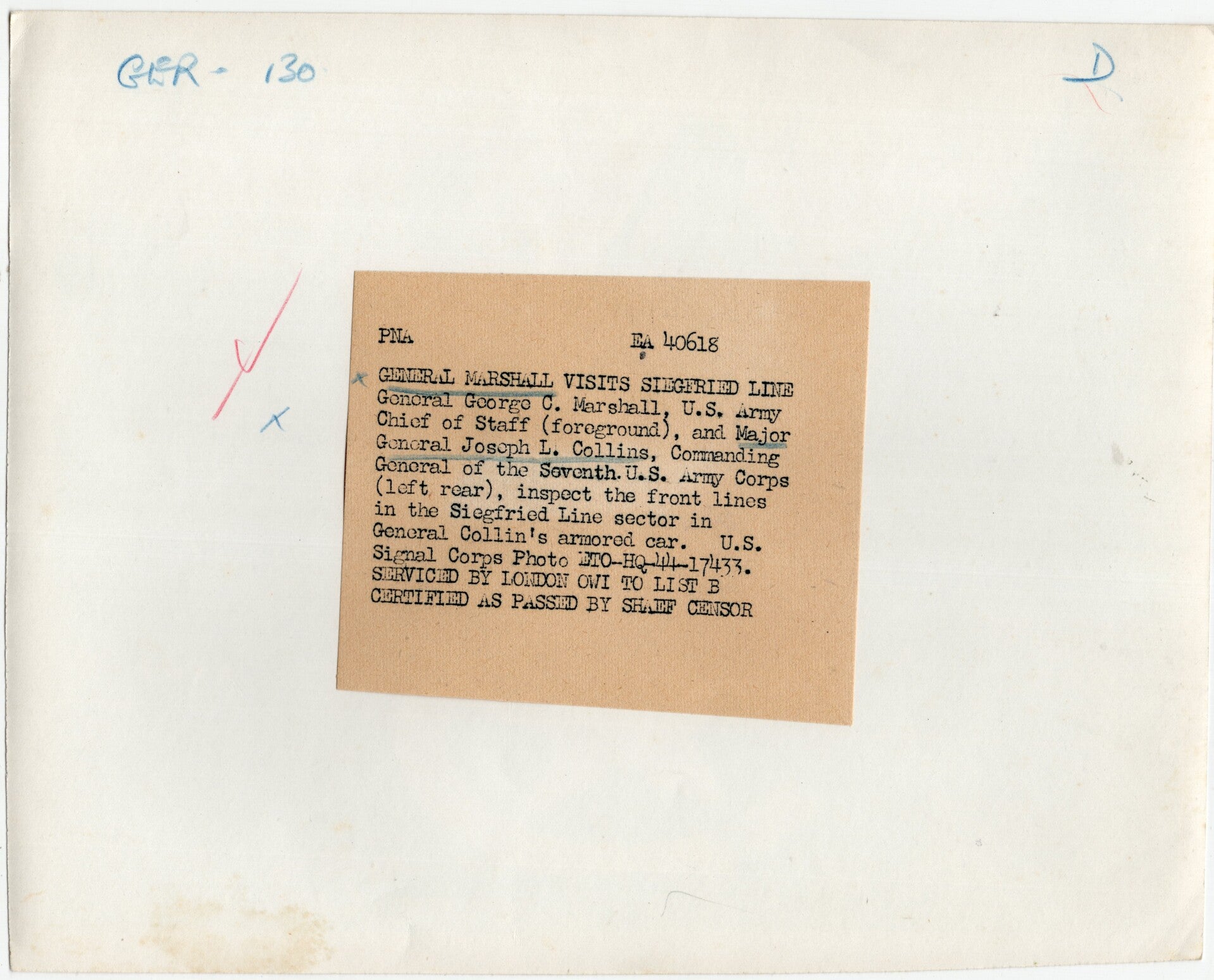 Original WW2 US Press Photo - General Marshall with Major General Joseph Collins, 7th US Army, Siegfried Line (1944)