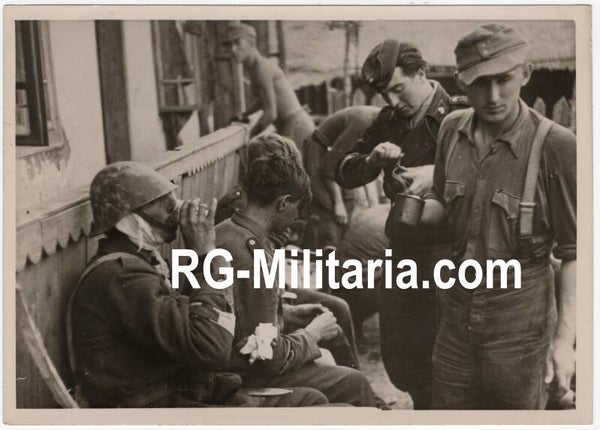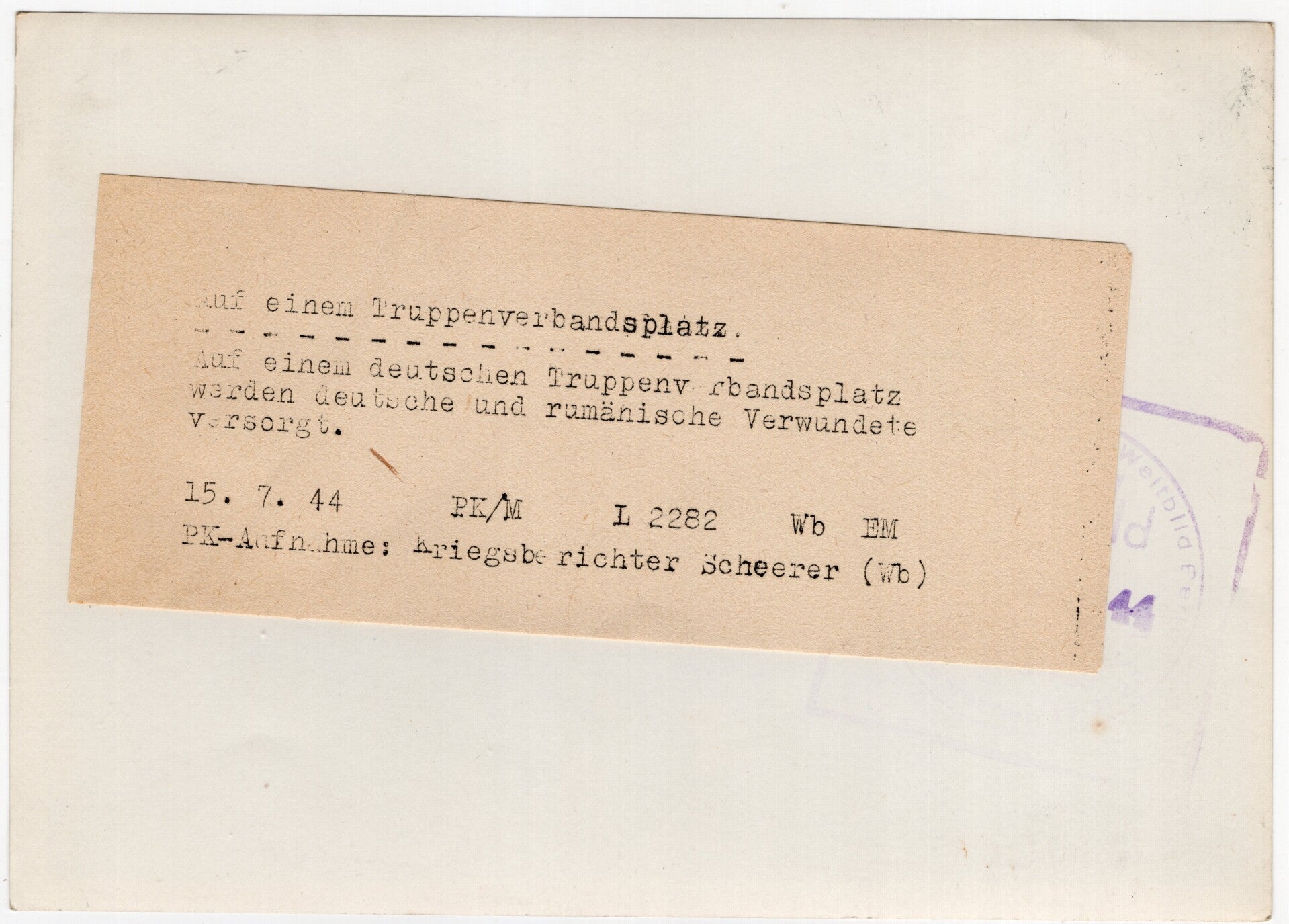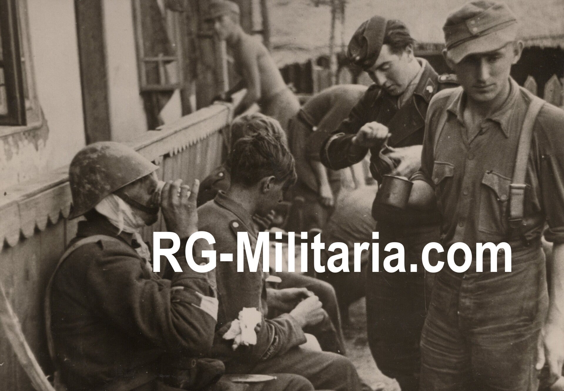 Original WW2 German Press Photo - Romanian and Panzer soldiers at the Truppenverbandsplatz, field hospital (1944)