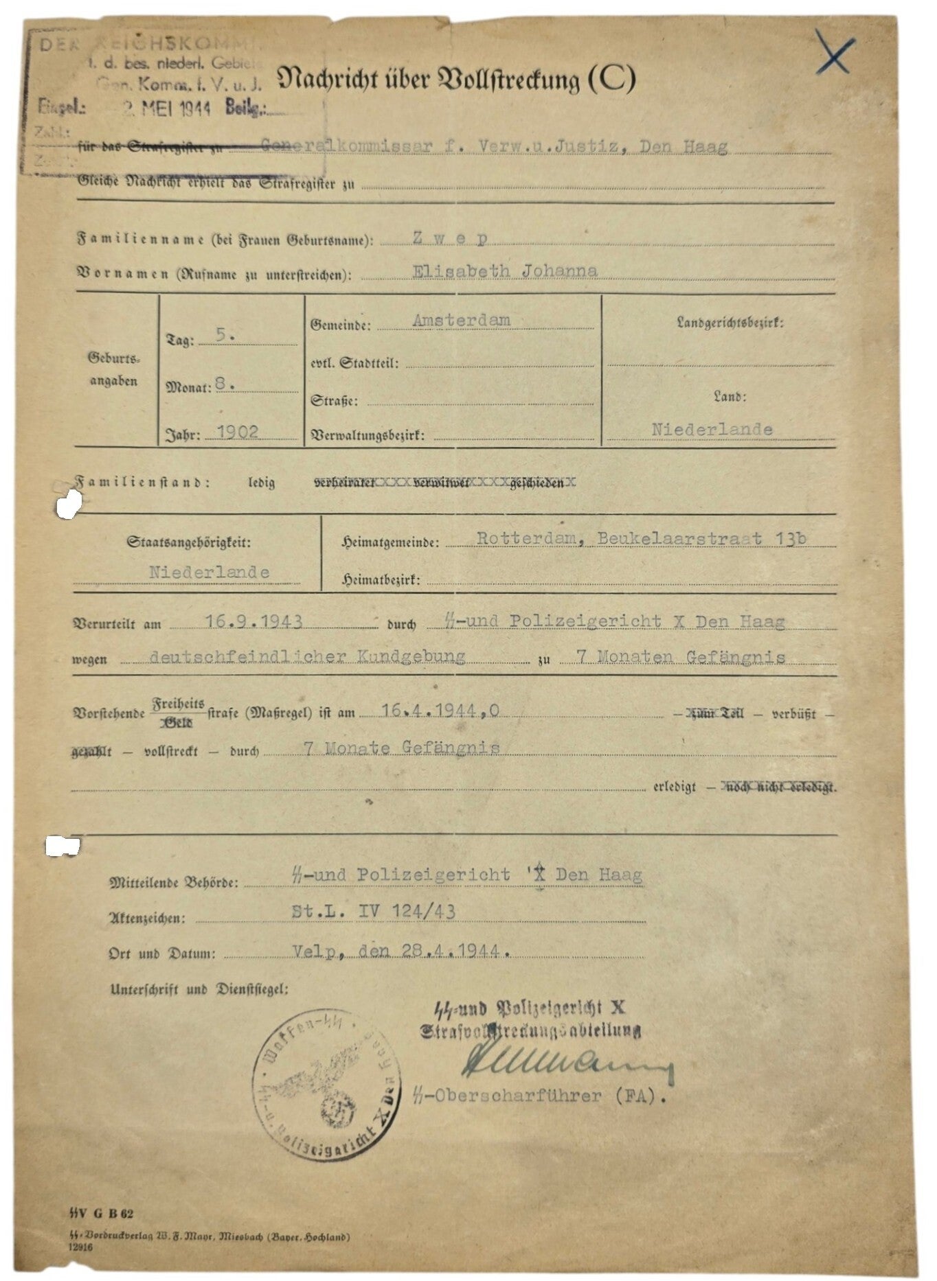 7 months jail time for an Amsterdam woman living in Rotterdam for speaking out against the Nazi regime. She was imprisoned in The Hague. An SS Oberscharführer signed the sentence.