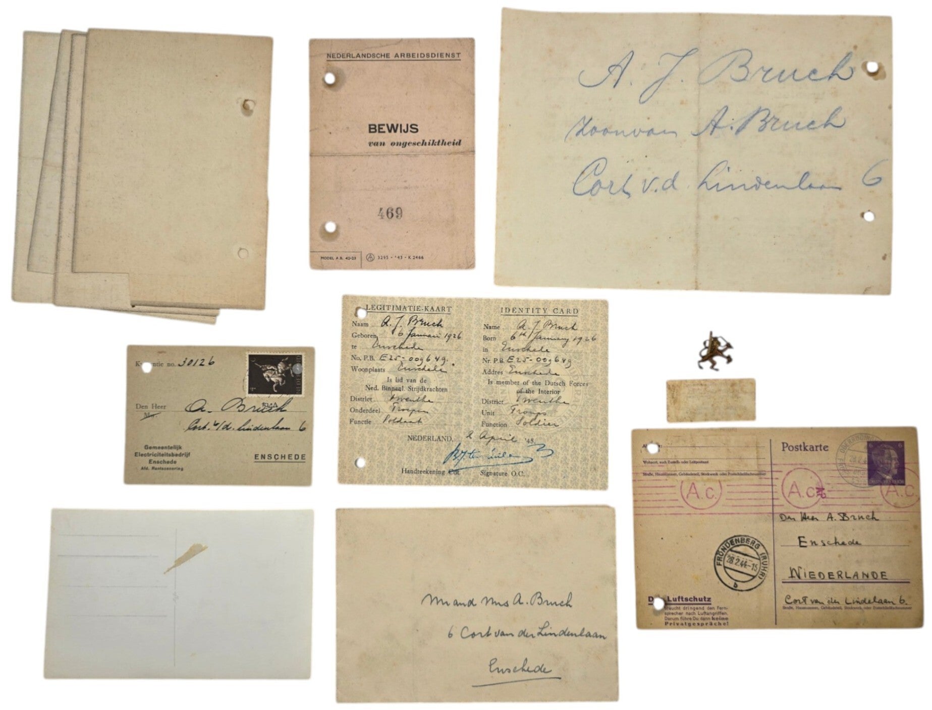 Interessant documentenset van een verzetsstrijder uit Enschede. Bevat onder andere zijn NBS-identiteitskaart, een NAD-kaart (Nederlandse Arbeidsdienst), een brief van een arbeider in Duitsland, een foto en meer.