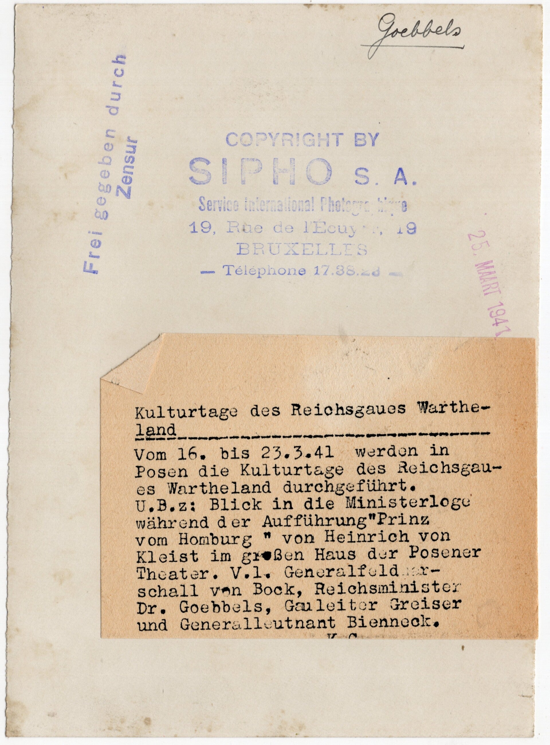 Originele Wo2 Duitse Persfoto - Reichsgaues Wartheland Haus der Posener Theater met Joseph Goebbels en Generalfeldmarschall von Bock (1941)