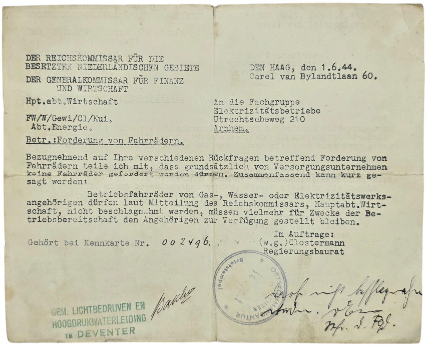 Original WW2 Dutch Document - Seizing of bicycles in Deventer, Arnhem (1944)